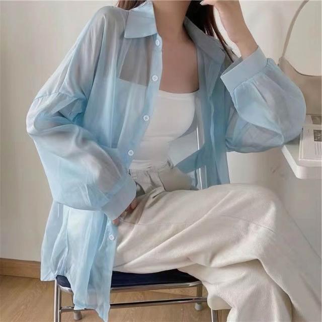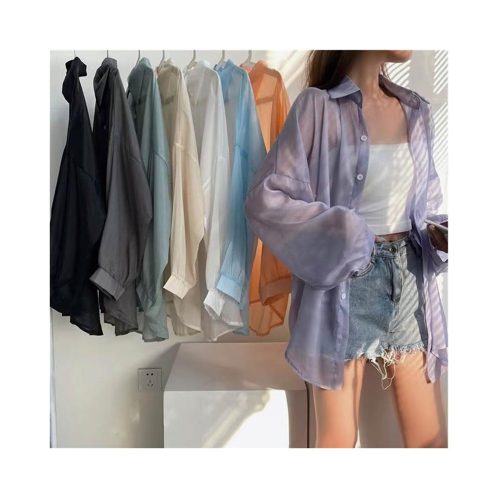 珠光 亮紗 女裝 夏季 設計感 薄款 微 透 長袖 別致 休閒 寬鬆 襯衣 女生衣服 SG05102(#女裝 #韓版 #襯衫 #雪紡)