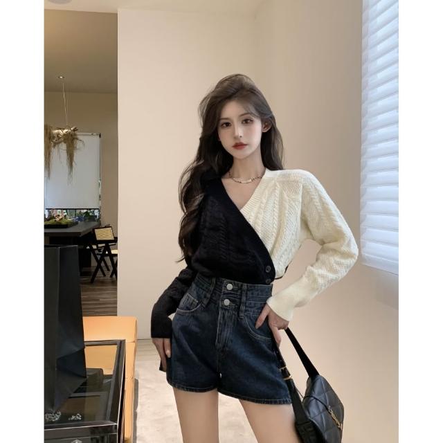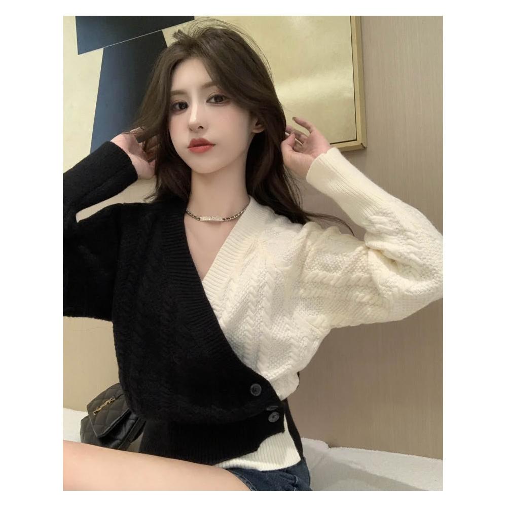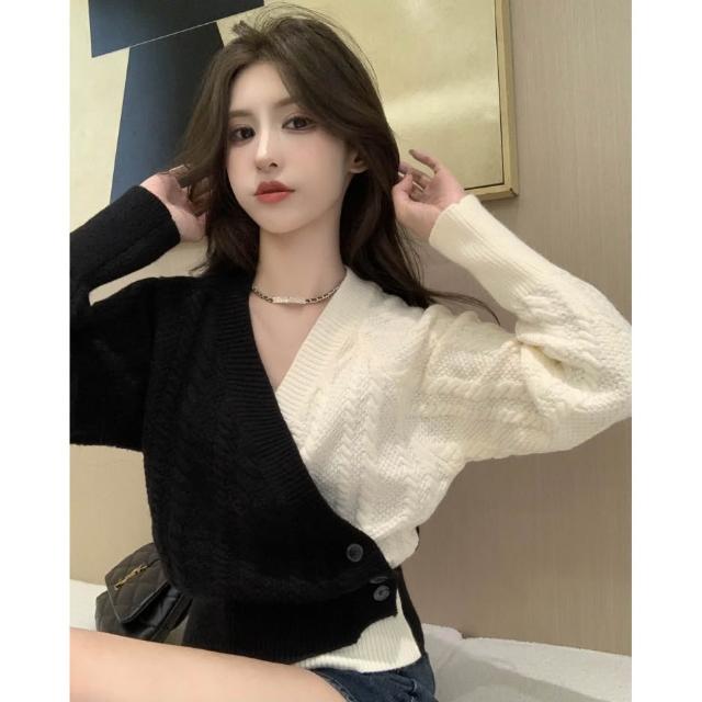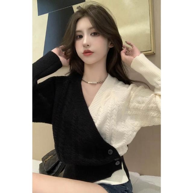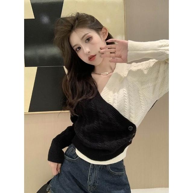 女生衣服 設計 交叉 V領 上衣 韓版 收腰 黑白 撞色 針織衫 毛衣 潮 毛衣 針織 針織上衣 氣(#女裝 #韓版 #毛衣 #針織衫 #上衣)