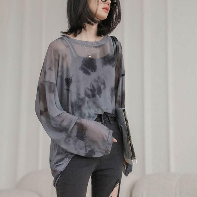 新款 寬鬆 韓系 紮染 微 透 網紗 長袖 t 恤 洋氣 防曬 打底 衫 薄款 上衣 女裝 女生衣服 t恤 休閒 上衣(#女裝 #韓版 #長袖上衣)