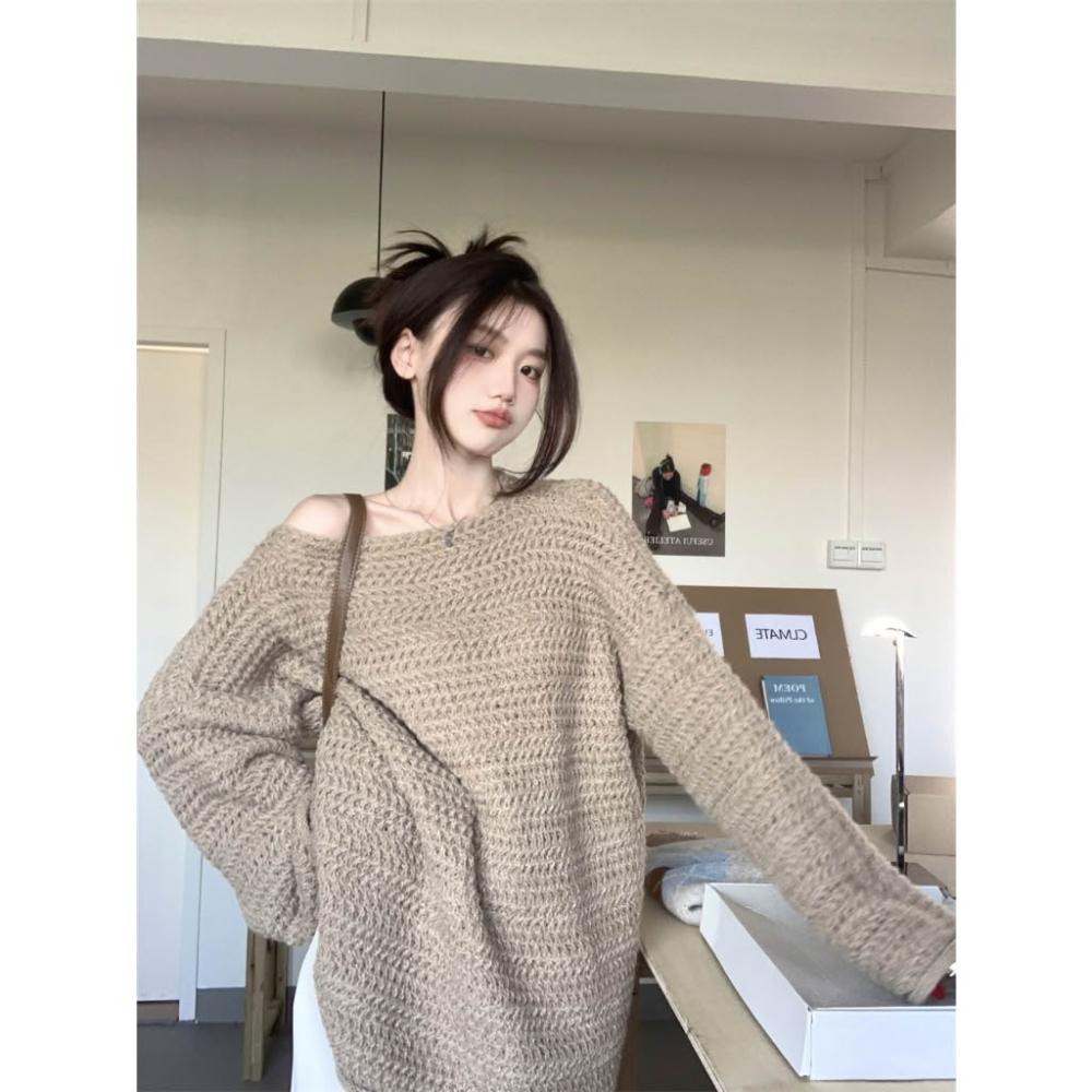 法式 針織衫 秋冬 甜美 溫柔 女裝 女生衣服 斜肩 毛衣 慵懶風 露肩 上衣 毛衣 針織 針織上衣(#女裝 #韓版 #針織衫 #上衣)