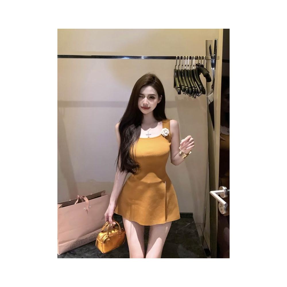 辣妹 桔色 花朵 針織 小吊帶 女 夏季 收腰 顯瘦 方領 無袖 背心 開叉 上衣 外穿 女生衣服 女裝 毛衣 針織 緊(#女裝 #韓版 #套裝#連身裙)