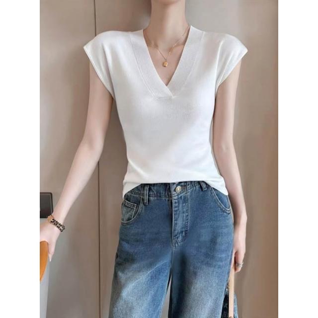 法式 氣質 黑色 V領 短袖 針織 T恤 女 夏季 新款 氣質 顯瘦 時尚 洋氣 上衣 女生衣服 女裝 毛衣 針織 SG(#女裝 #韓版 #短袖上衣 #針織衫)