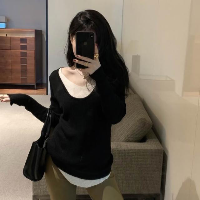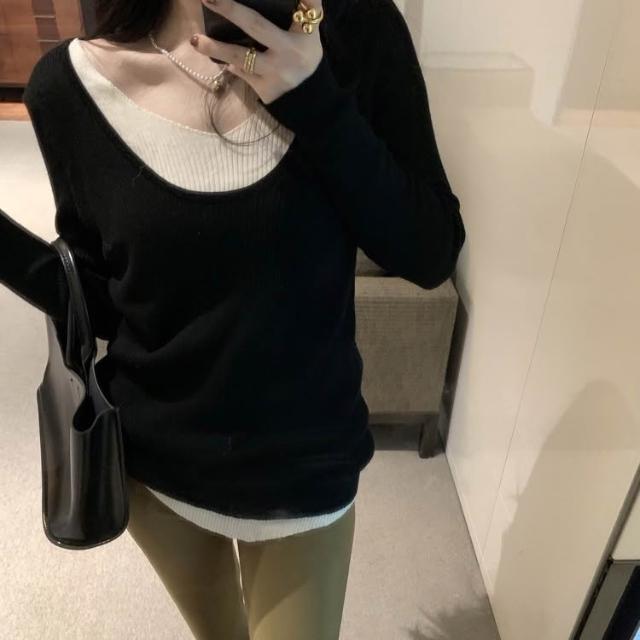 秋冬 V領 不規則 針織衫 假兩件 女裝 女生衣服 休閒 內搭 打底 毛衣 上衣 毛衣 針織 氣質(#女裝 #韓版 #長袖上衣 #針織衫)