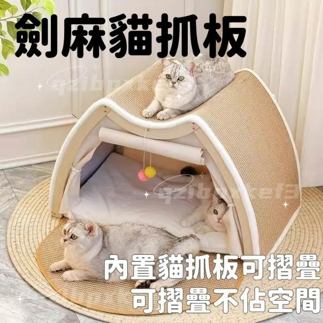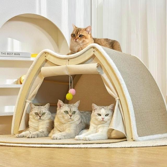 實木貓咪屋 劍麻貓抓板 封閉式貓窩 一體貓帳篷 四季通用 耐磨超大狗窩 寵物帳篷 多貓可用 頂部可睡
