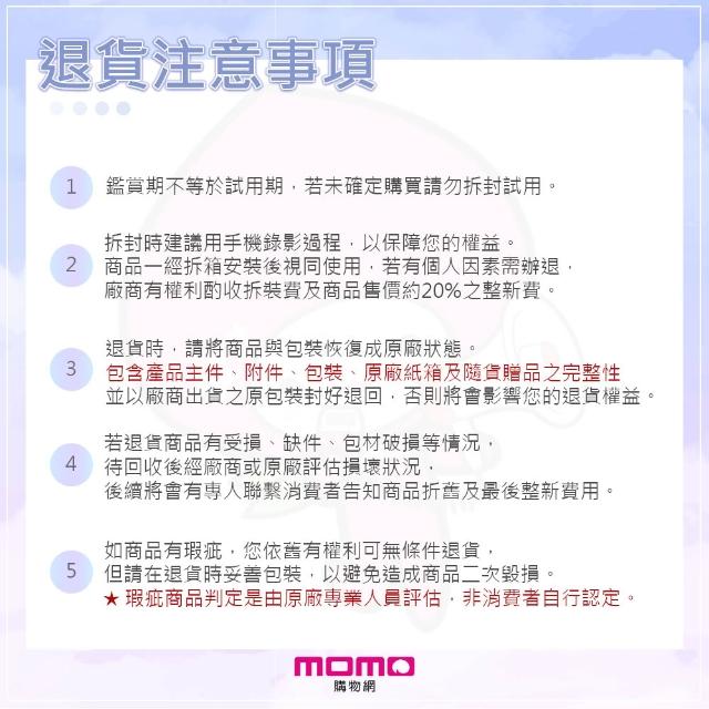 - 商品到貨享十天猶豫期之權益(注意!猶豫期非試用期),依法辦理退貨商品必須是全新狀態且包裝完整(包含主機、附件、內外包裝、隨機文件、贈品等)。如商品一經拆封或使用致商品價值受損(例僅得以福利品出售),商店將向消費者就商品一部或全部價值減損收取適當之費用(回復原狀、整新費),否則將影響退貨的權限。請先確認商品正確、外觀可接受,再行開機/使用,以免影響您的權利,祝您購物順心。