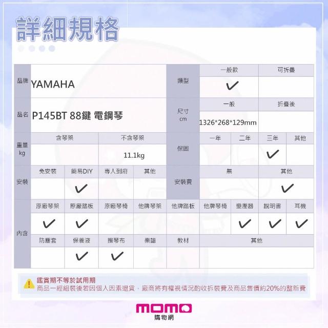 Yamaha 山葉音樂P145BT 88鍵 數位鋼琴 電鋼琴 (送3年保固/手機錄音線/耳機/鋼琴保養油組)