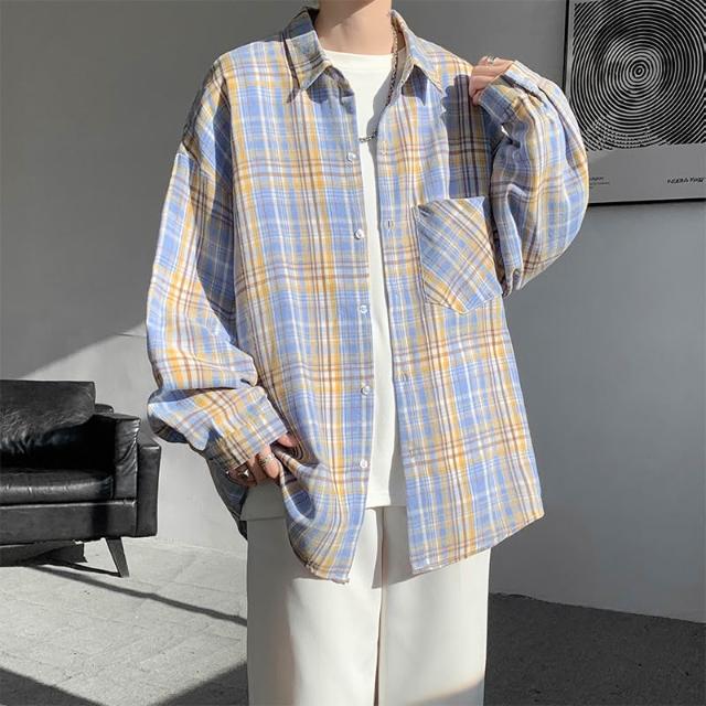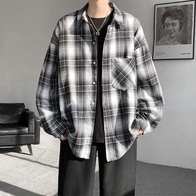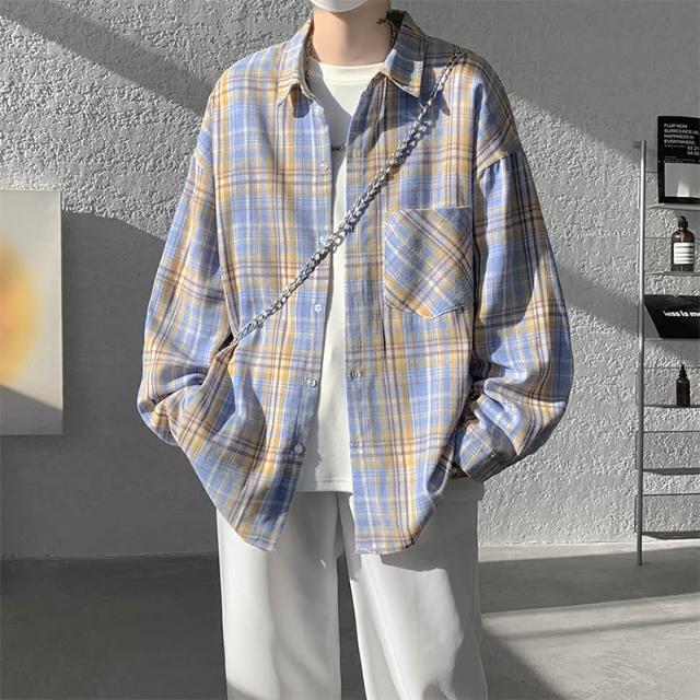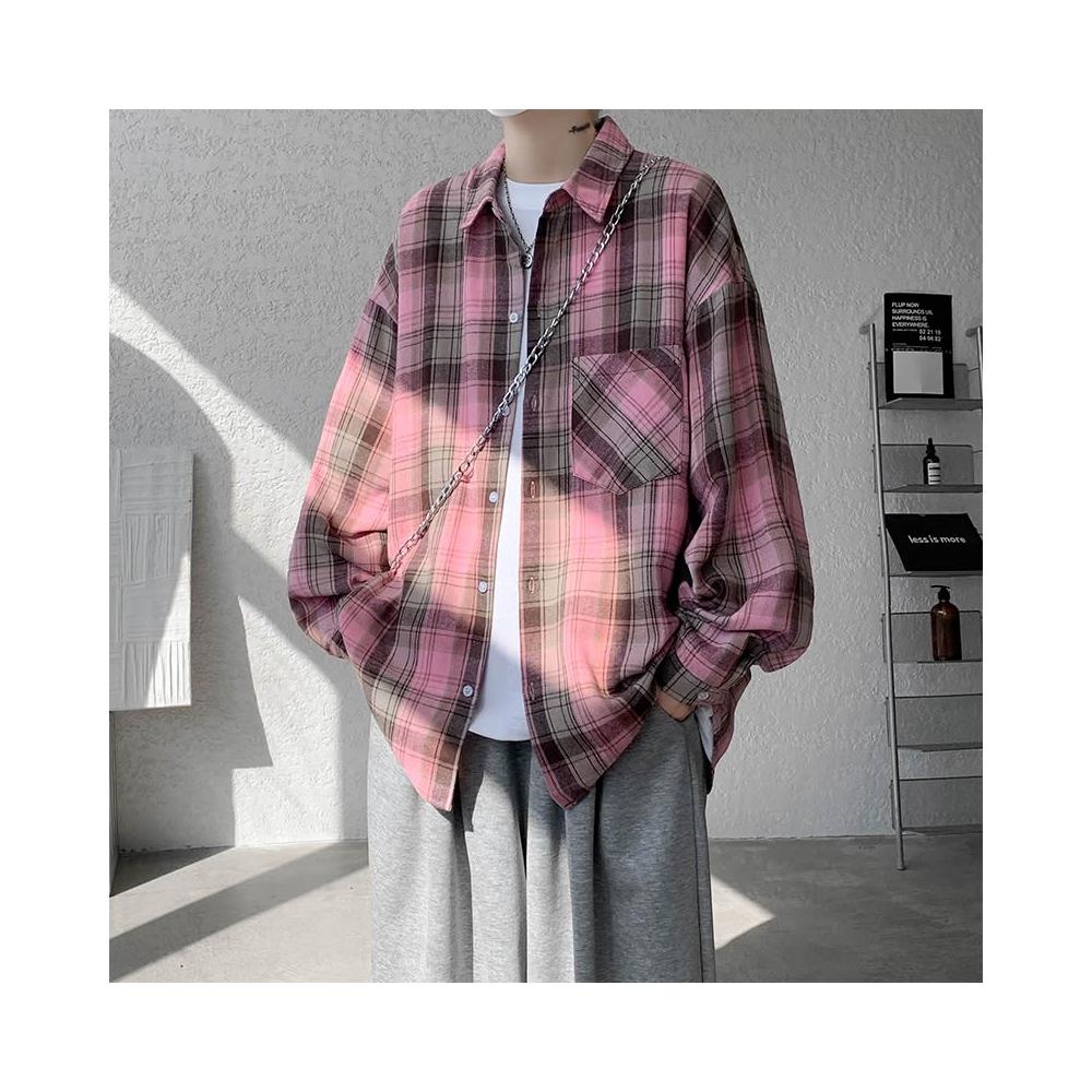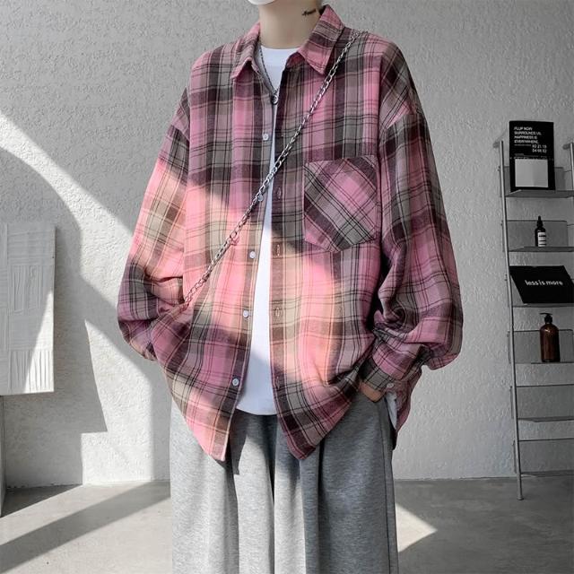 粉色格子襯衫男款美式復古高級感小眾設計感長袖襯衣oversize外套