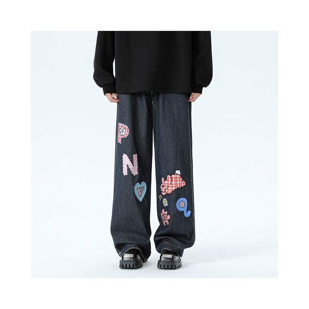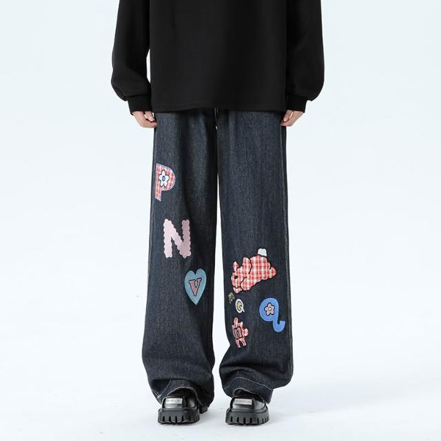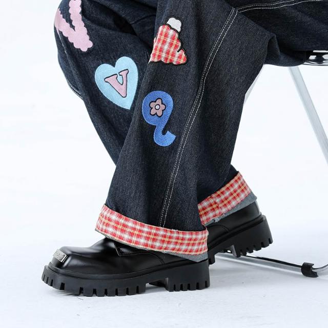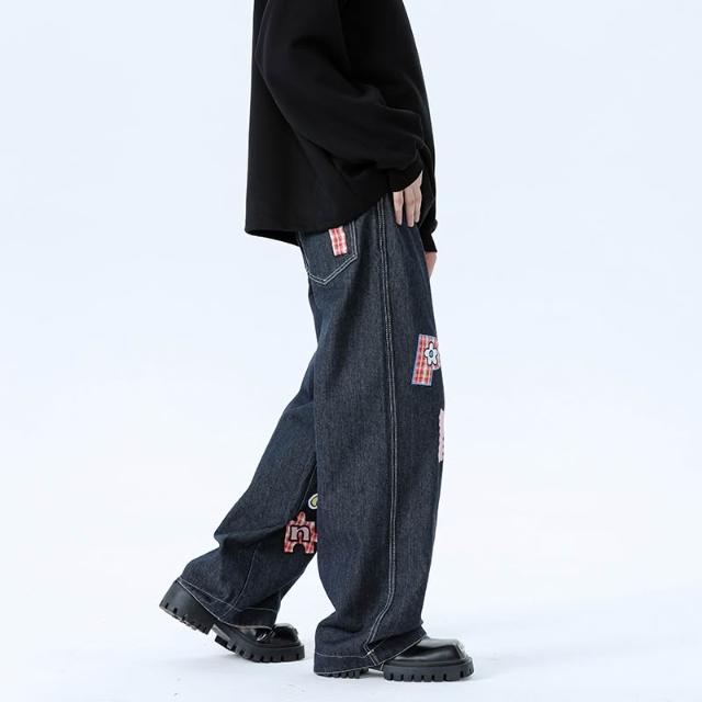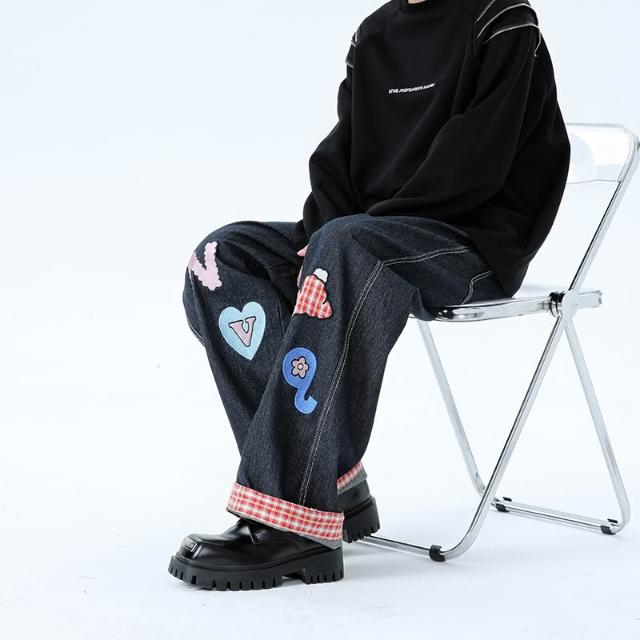 美式格子拼接卷邊牛仔褲春秋男女闊腿直筒寬鬆情侶卡通貼補刺繡休閑長褲
