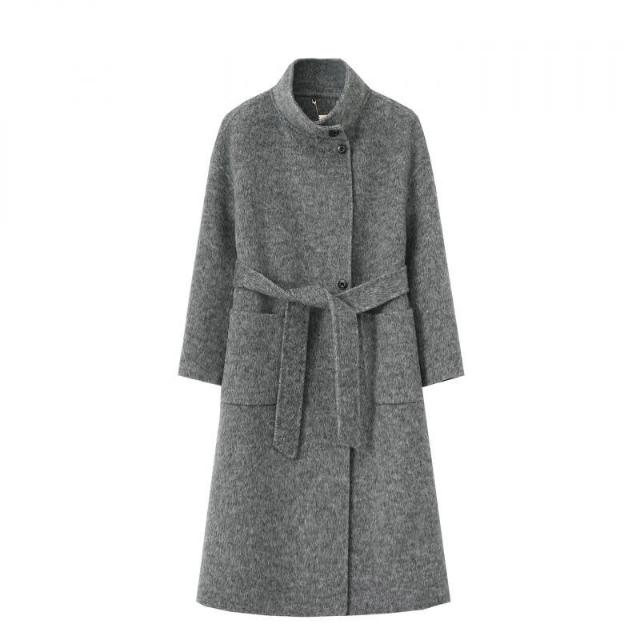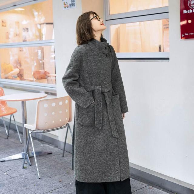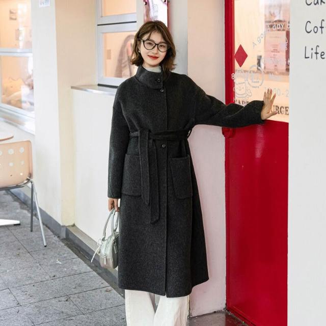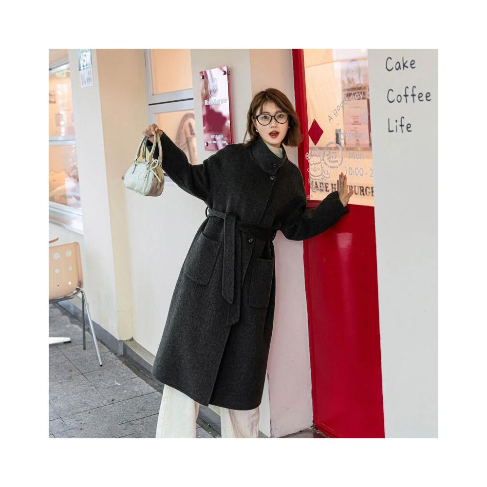 韓版立領長款雙面羊絨大衣秋冬系帶收腰顯瘦女款過膝加厚呢子外套