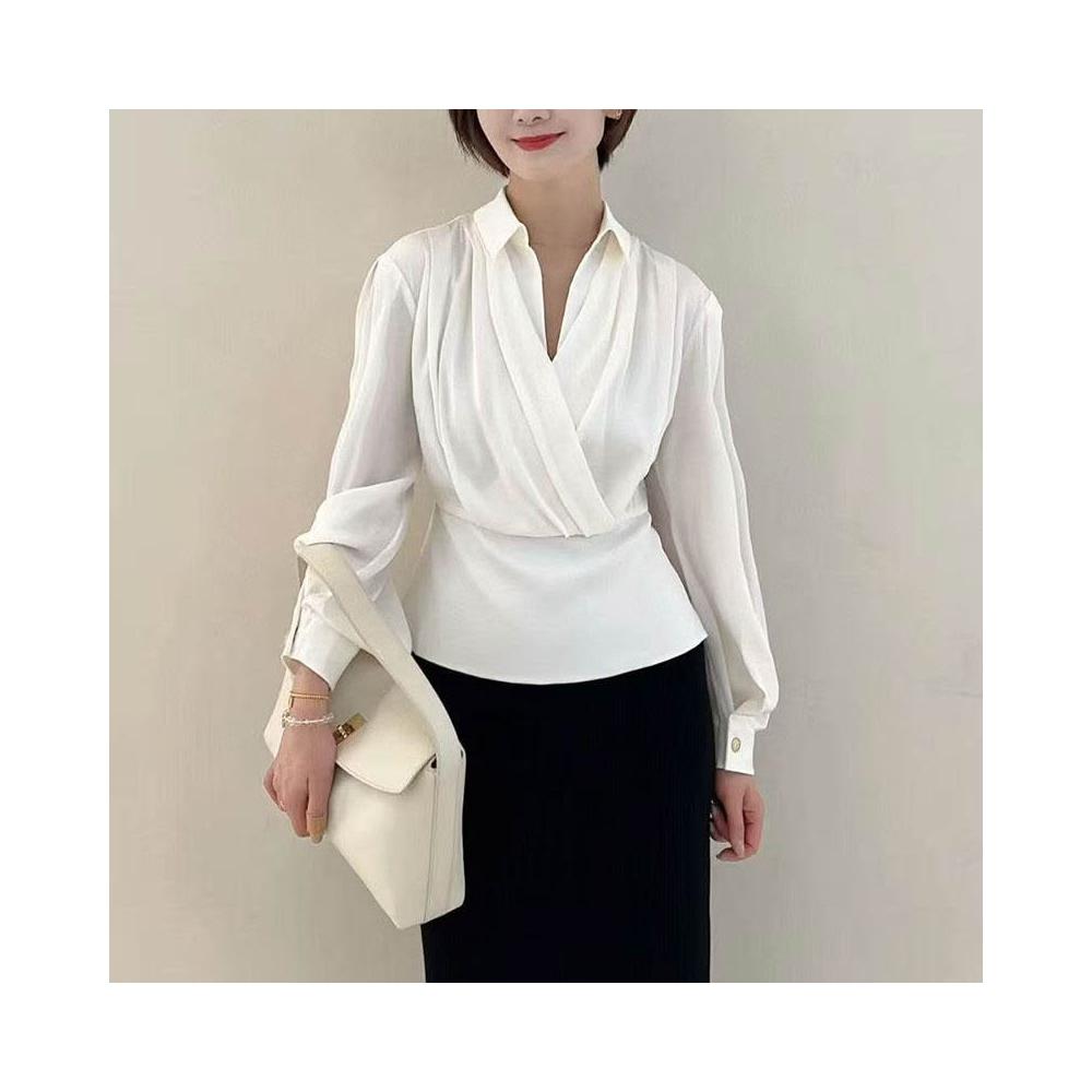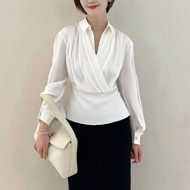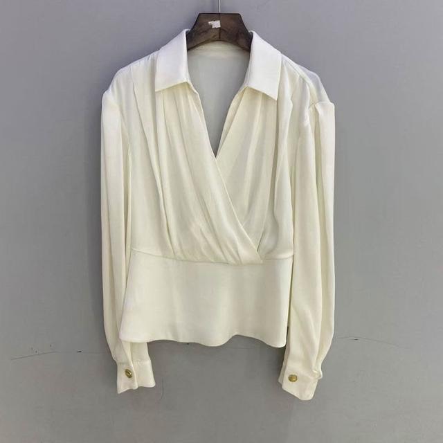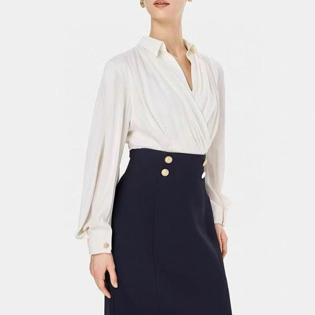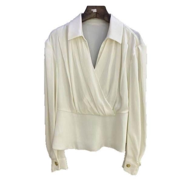 南油高端女裝port小姿25秋真絲法式氣質疊片束腰長袖V領襯衫上衣