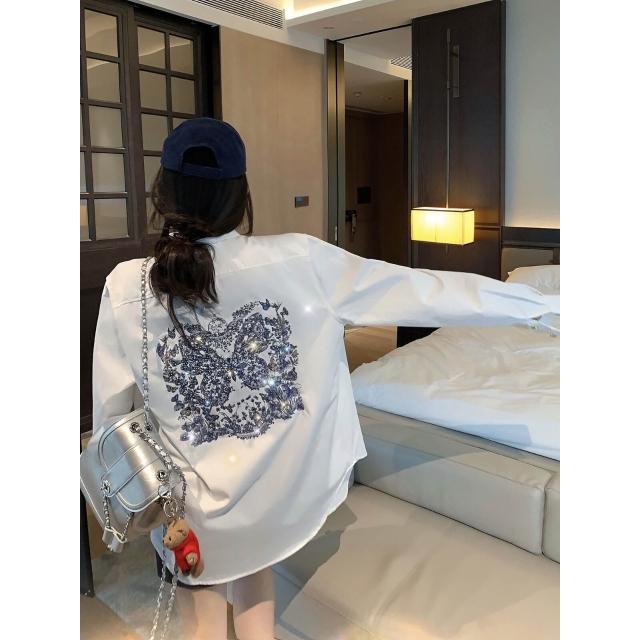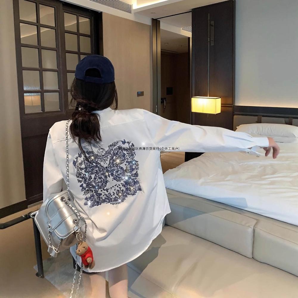網紅免燙抗皺白色蝴蝶燙鉆秋季薄款長袖襯衫女中長款襯衫其他