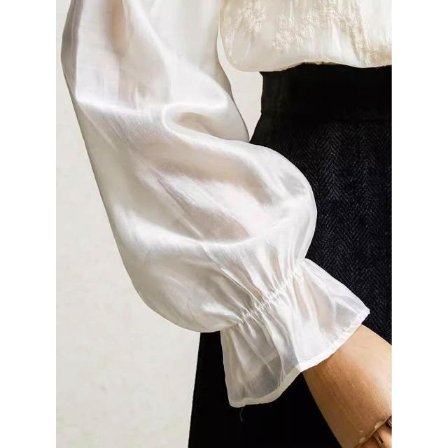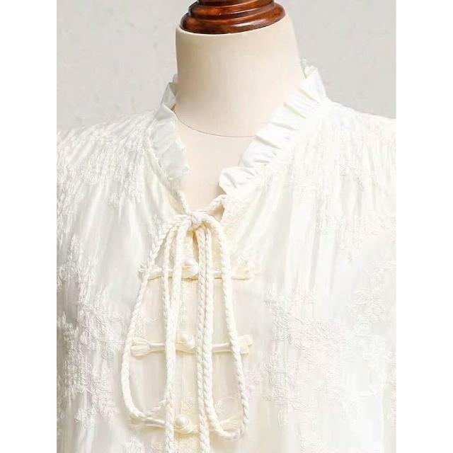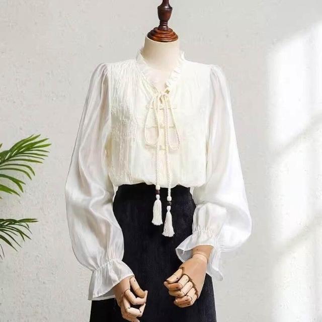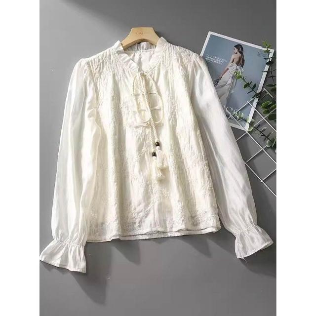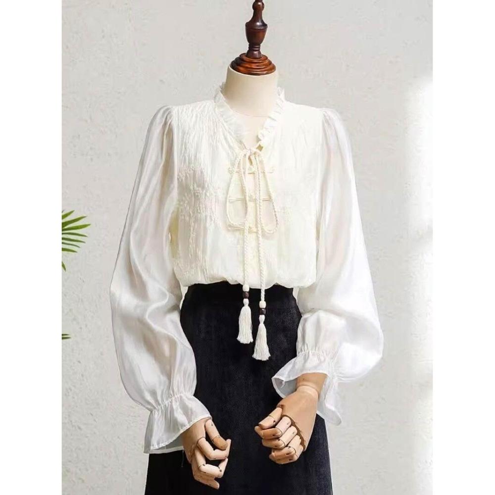 新中式國風長袖襯衫女2025秋季新款設計感邊刺繡系帶盤扣襯衣