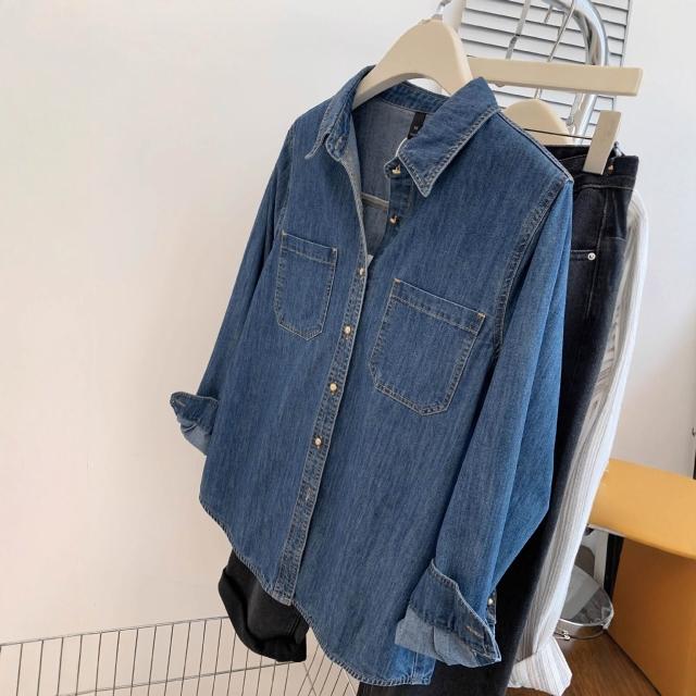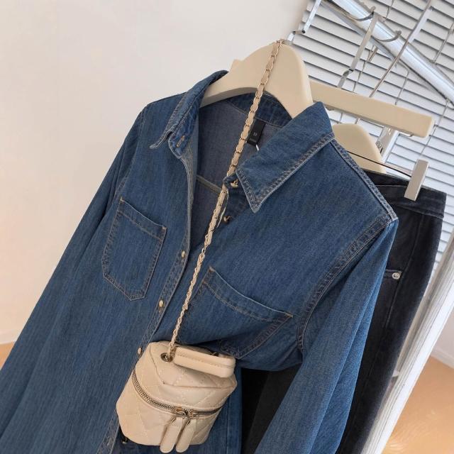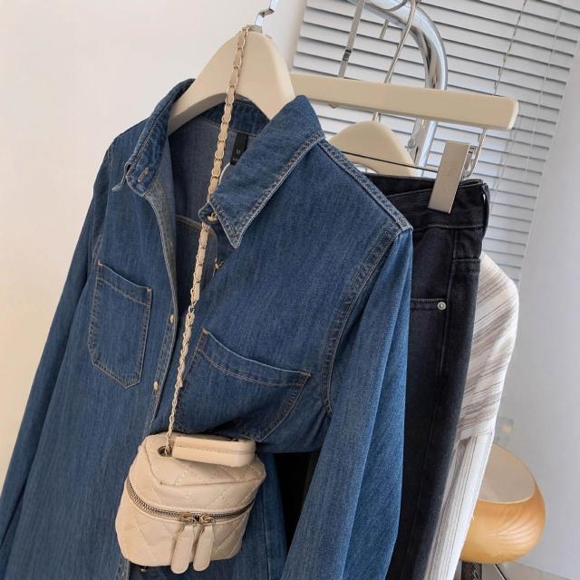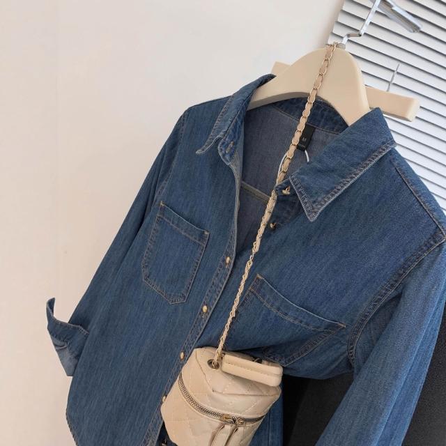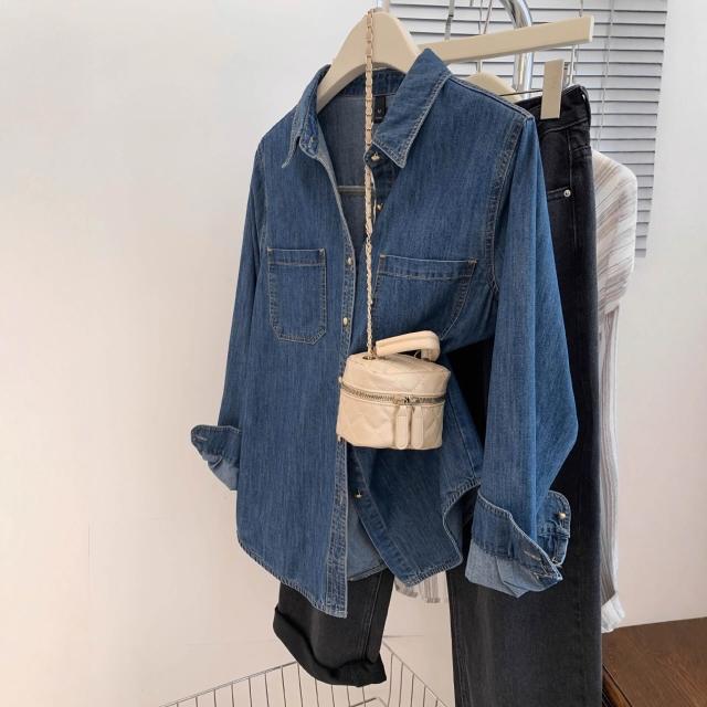 藍色牛仔襯衫外套女春秋季小個子設計感長袖襯衣2024早春新款上衣