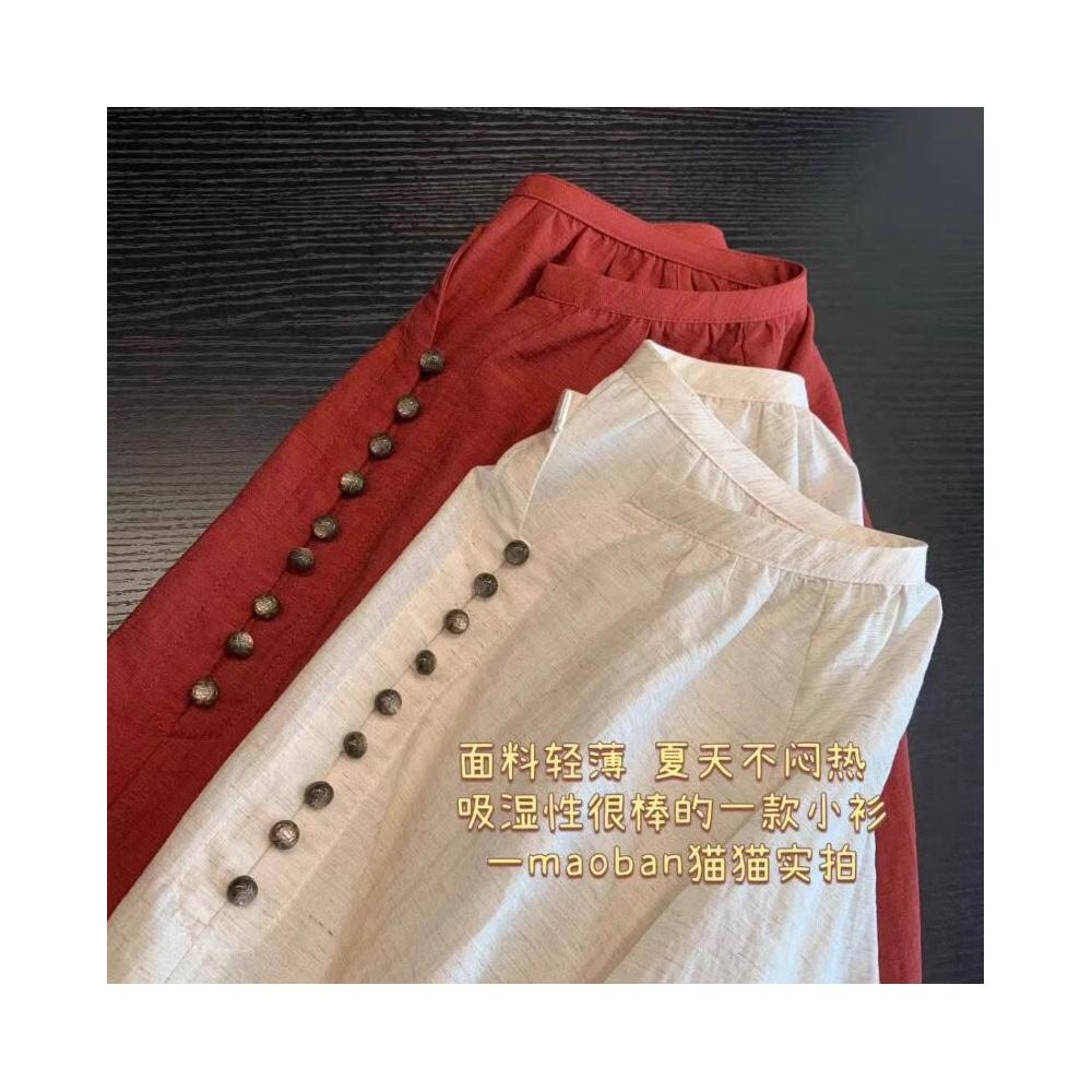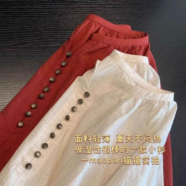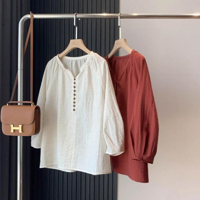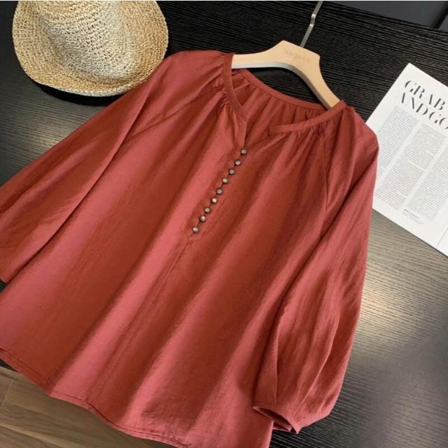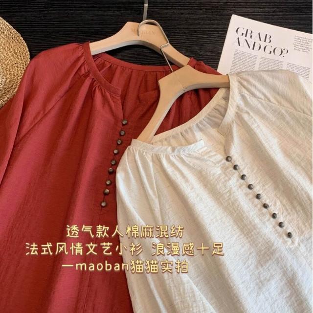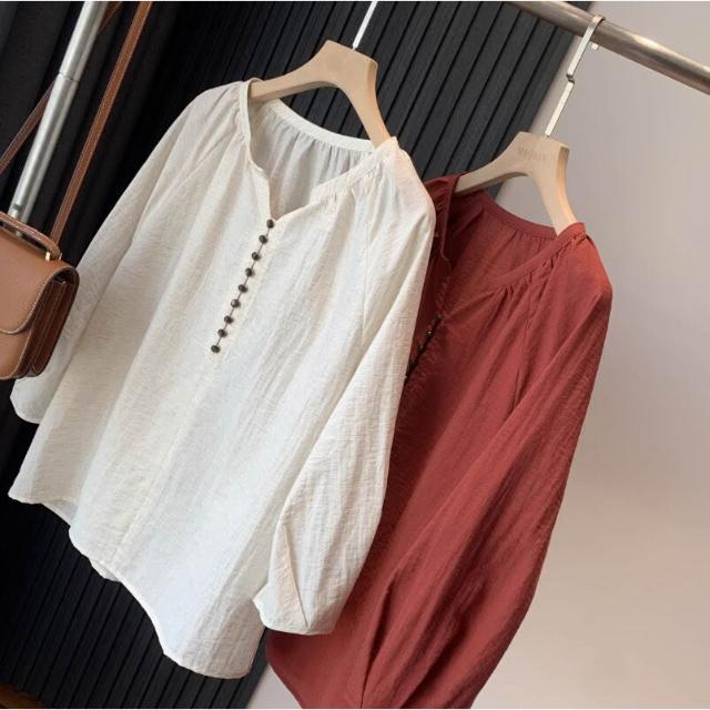 高端法式亞麻棉麻森系女裝上衣 寬松V領七分袖襯衫襯衣氣質小衫女
