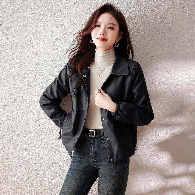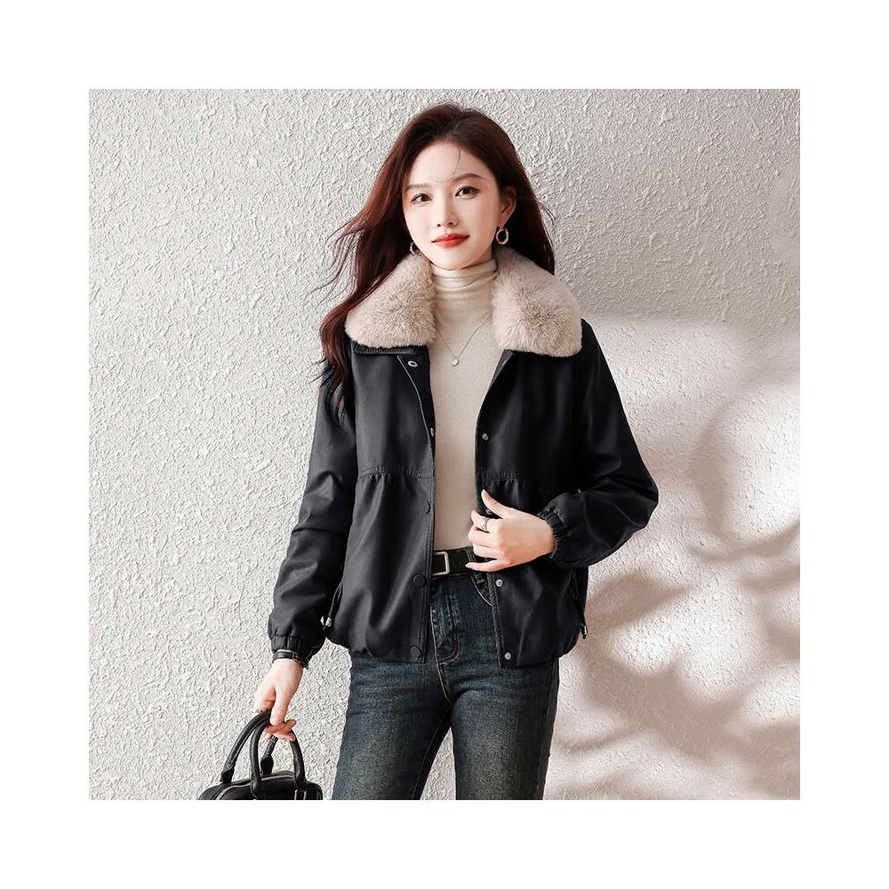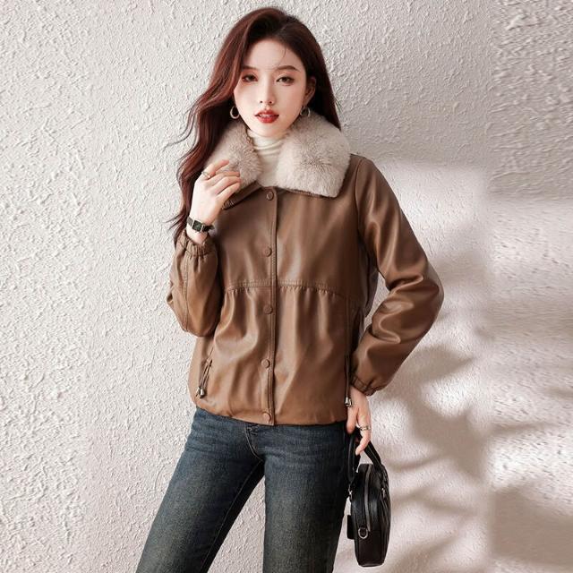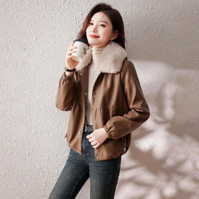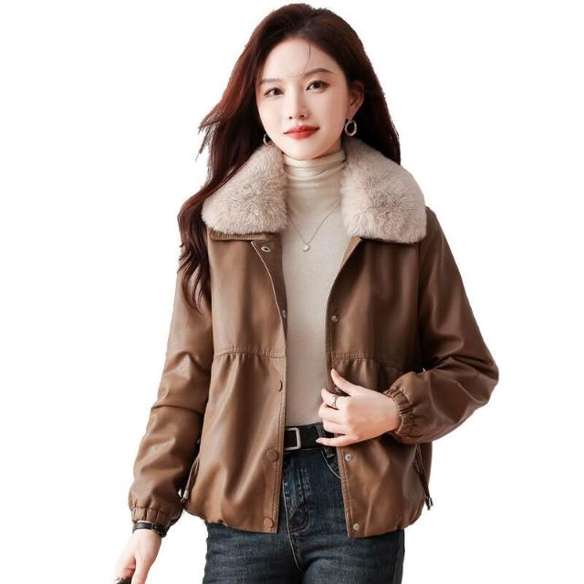 冬季時尚經典高品質綿羊皮毛領外套海寧真皮加絨小個子短款皮衣女