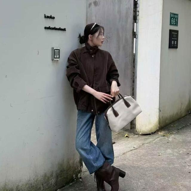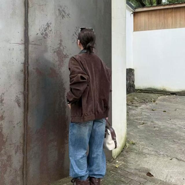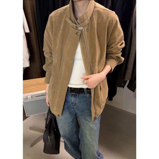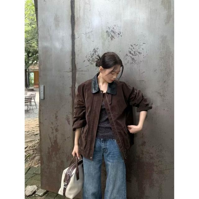 拼皮翻領環保麂皮外套女25ss秋冬韓系立領寬松拉鏈夾克上衣