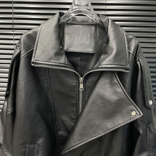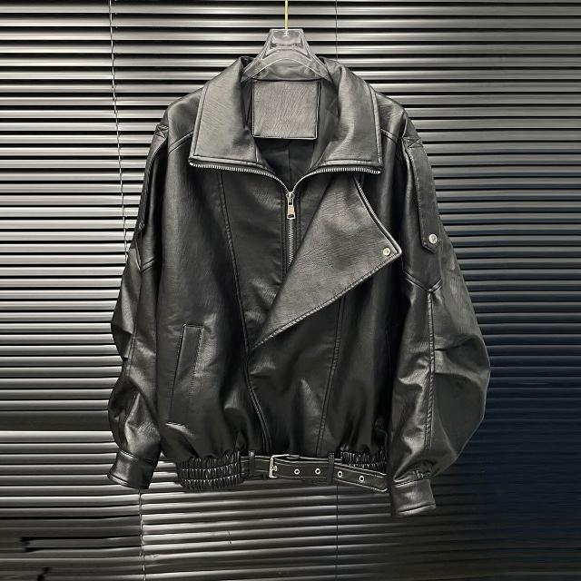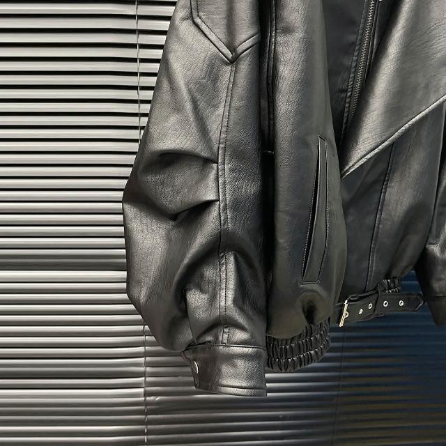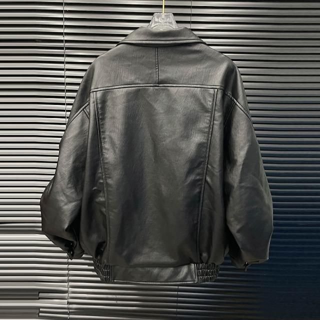2025年早秋新款黑色皮衣外套女設計感翻領抽褶寬松夾克上衣