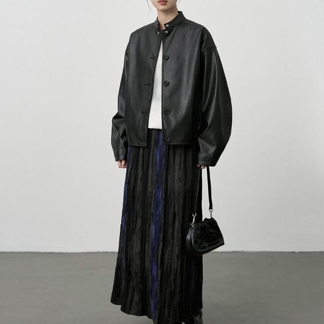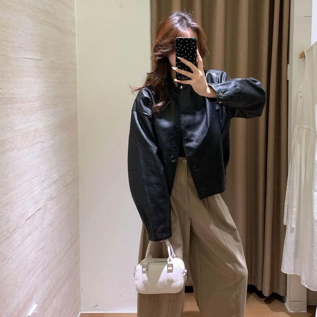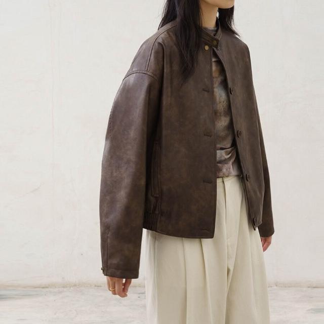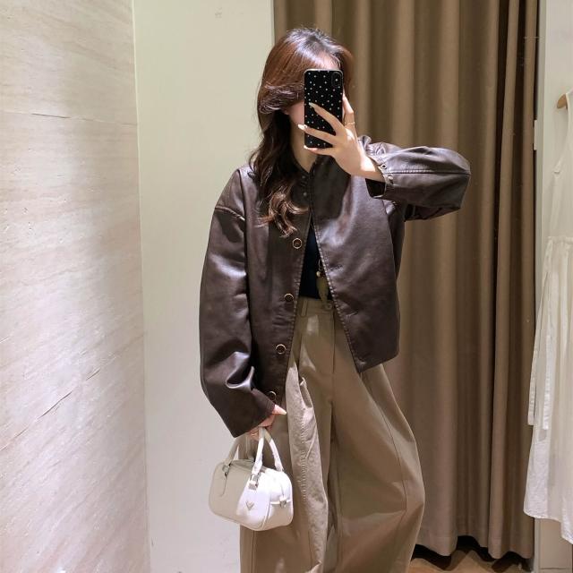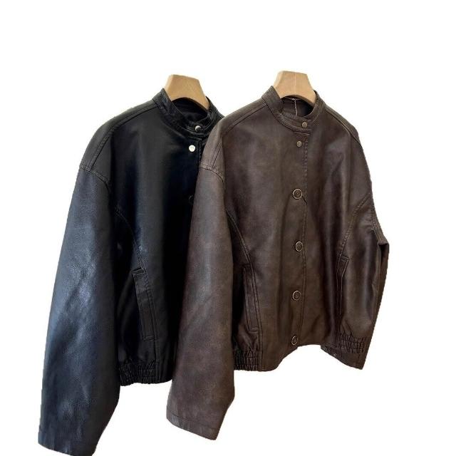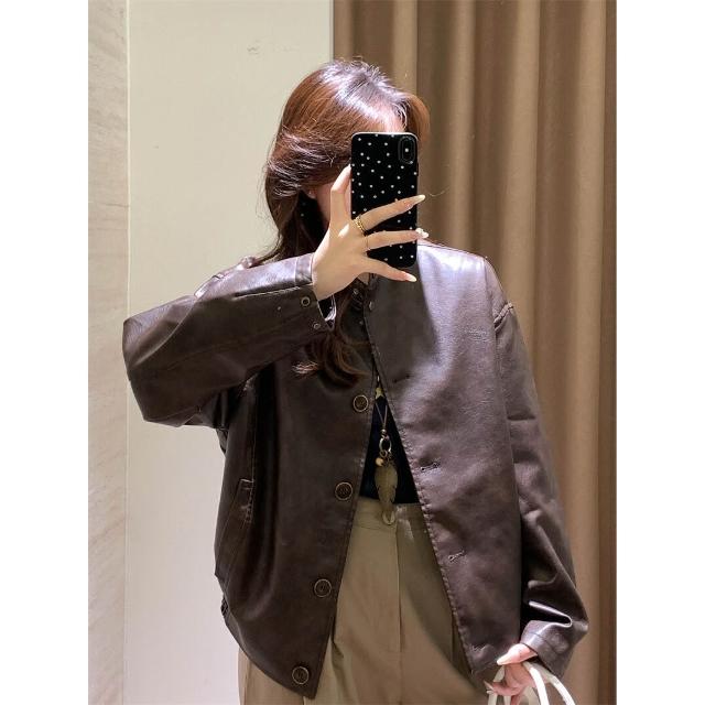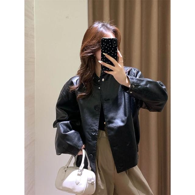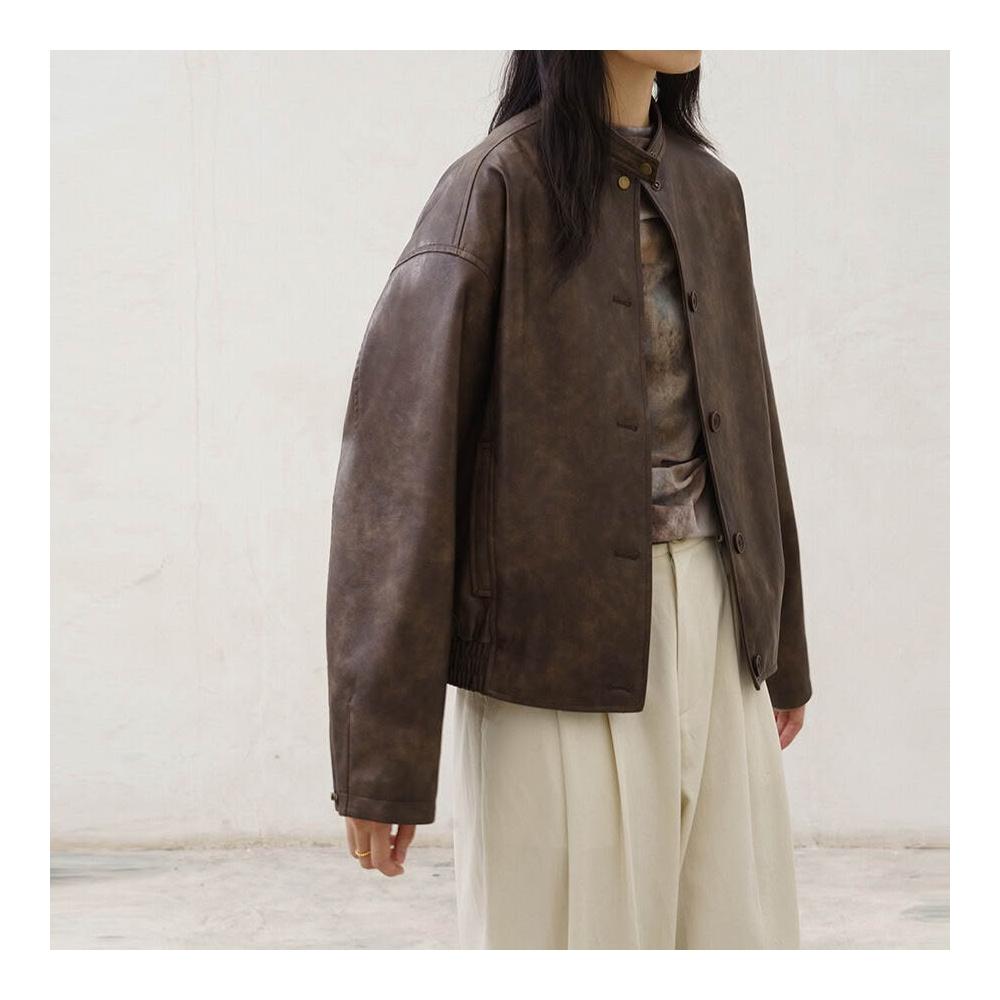 ‘城市獵人’早秋新款美拉德做舊圓領皮衣女外套PU皮長袖上衣