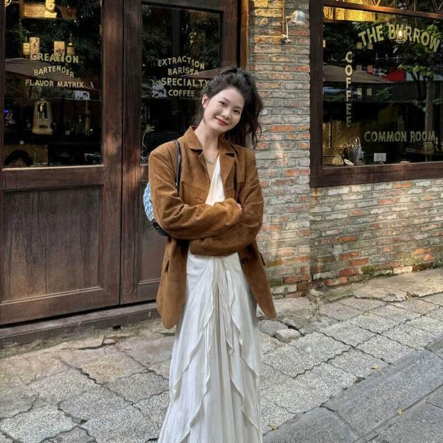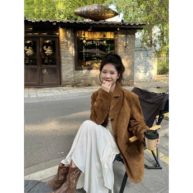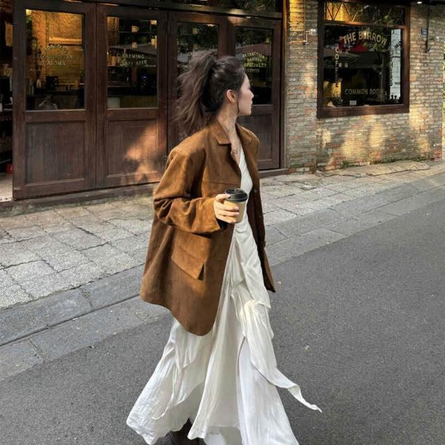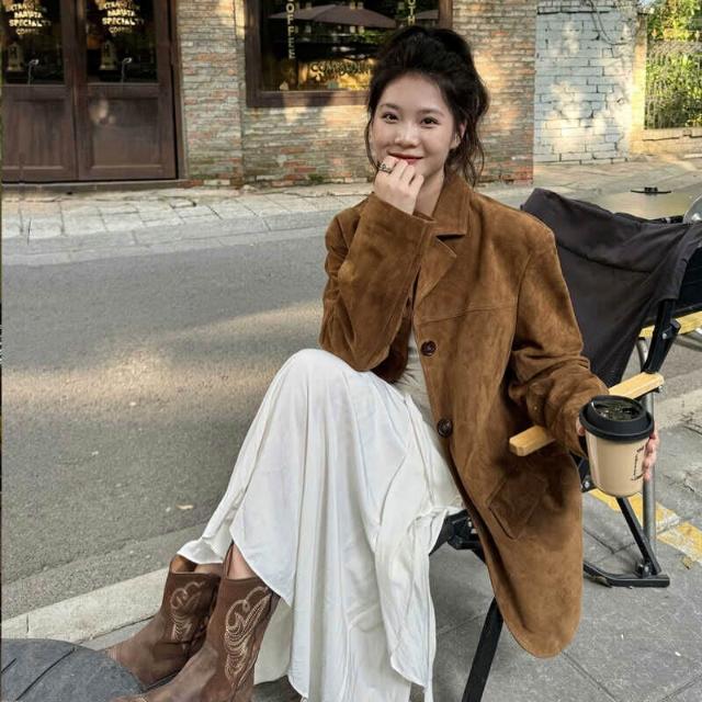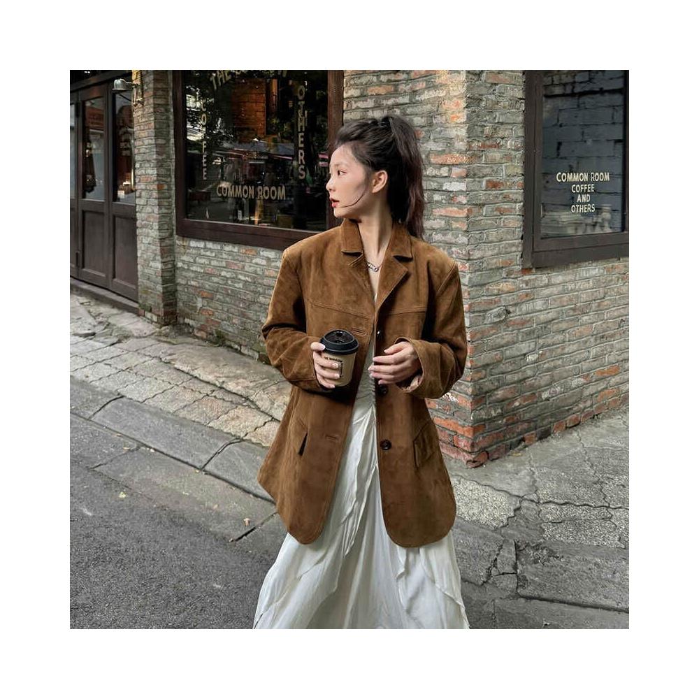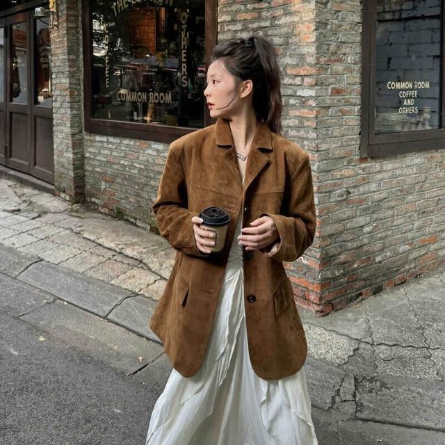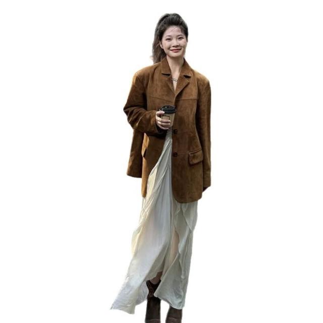 麂皮西裝外套女2025早秋季新款皮衣美拉德棕色感小個子咖色