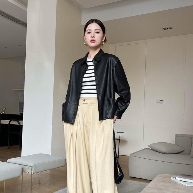 2025秋冬新款真皮皮衣女襯衫領短款黑色綿羊皮休閑簡約皮夾克外套