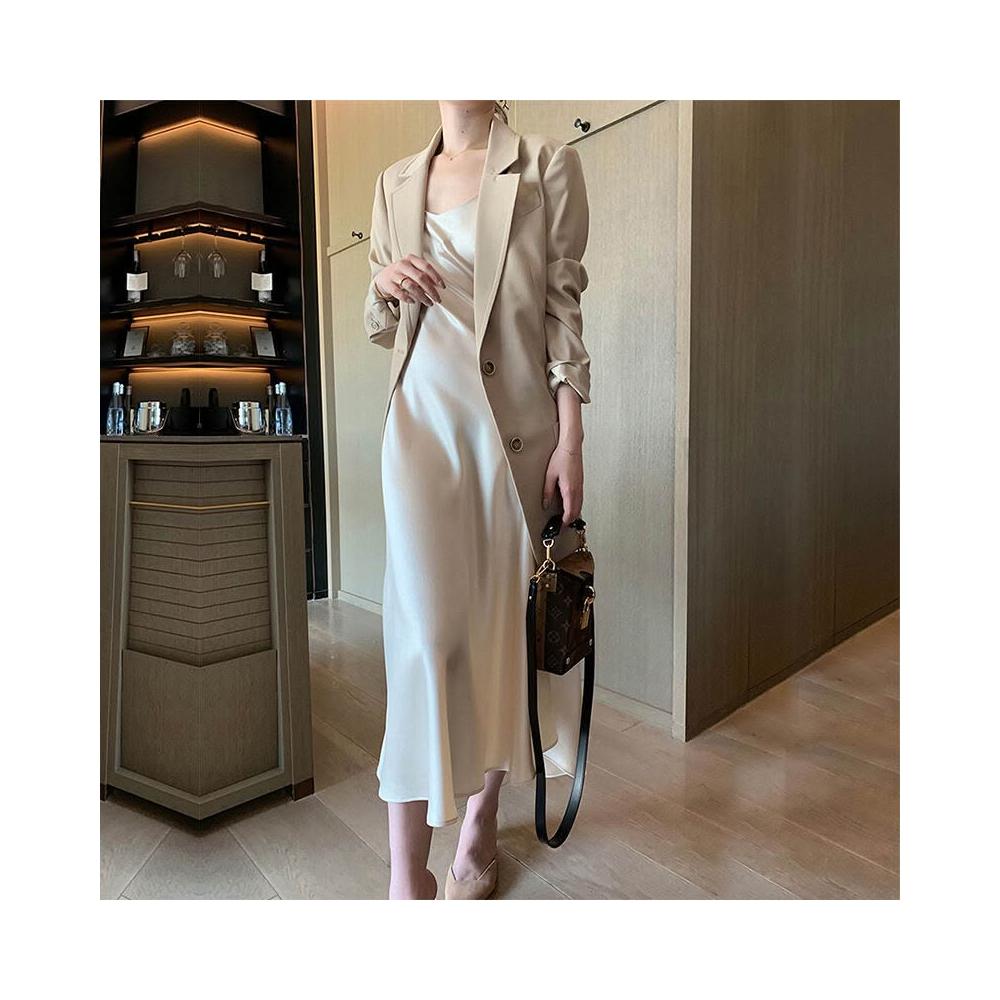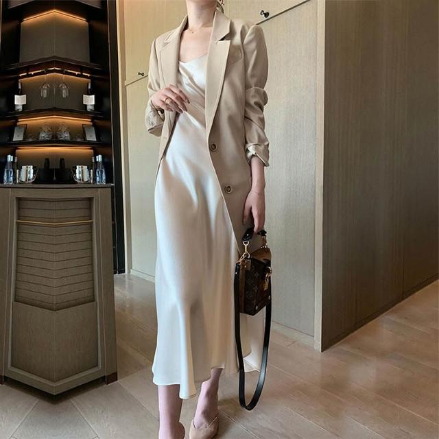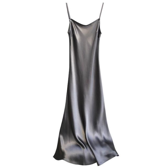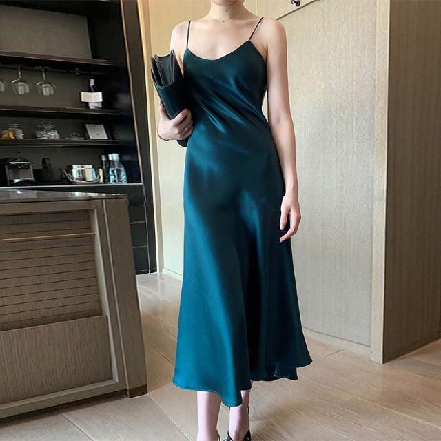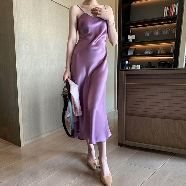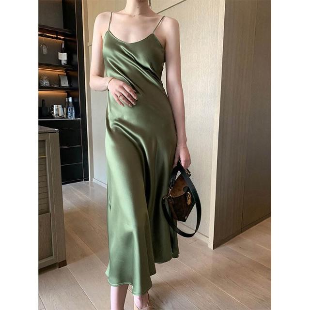 2025春夏醋酸連衣裙緞面顯瘦百搭網紅吊帶裙子抖音套裝長裙
