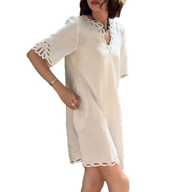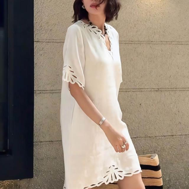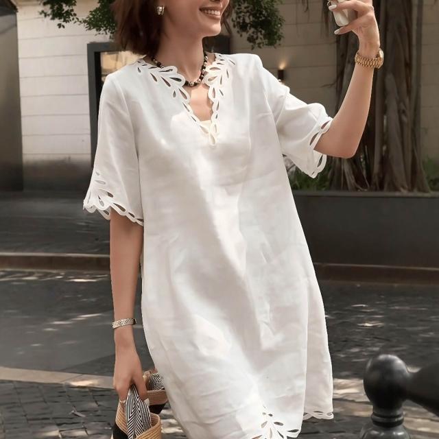 法式V領白色棉麻短袖連衣裙2025新款今年流行中長款裙子女夏