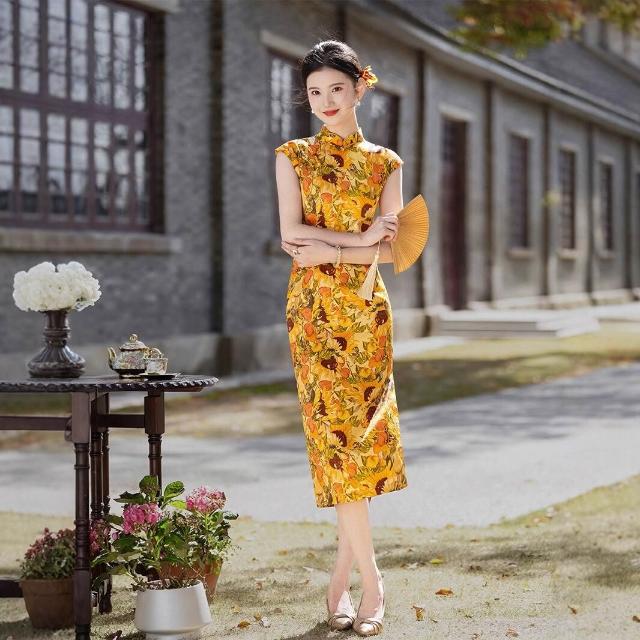 新中式改良黃色旗袍連衣裙高級感2025夏季小個子日常年輕顯瘦中長