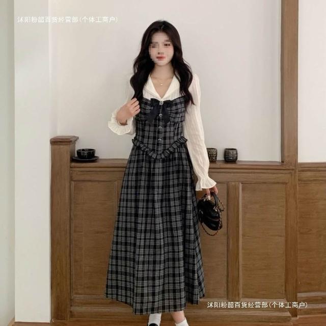 學院風長袖格紋連衣裙2025秋新款大碼設計感收腰假兩件通長裙