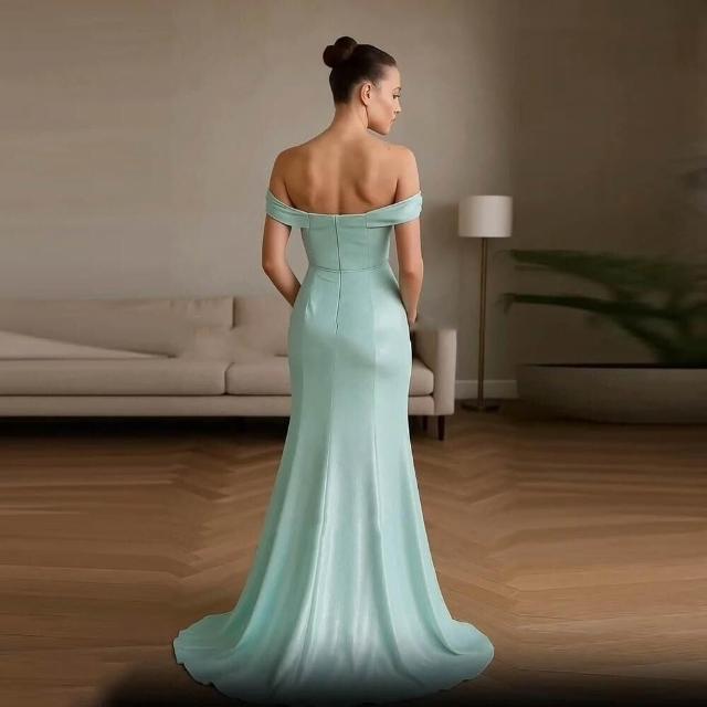 女裝晚禮服淺綠色一字肩修身顯瘦設計感小拖尾連衣裙派對長裙