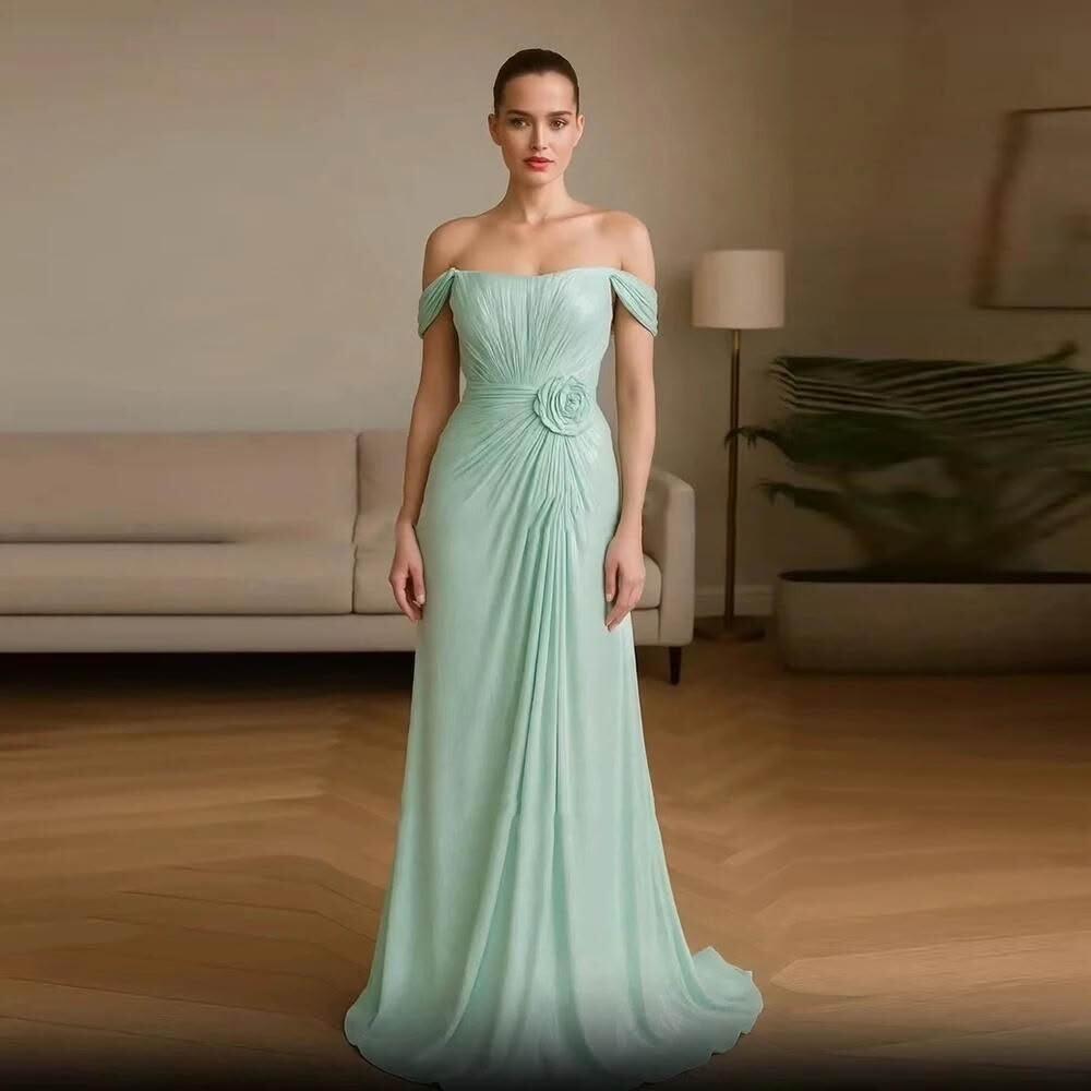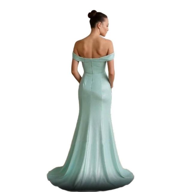 女裝晚禮服淺綠色一字肩修身顯瘦設計感小拖尾連衣裙派對長裙