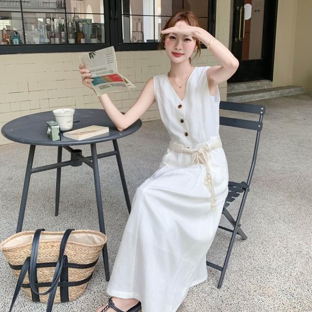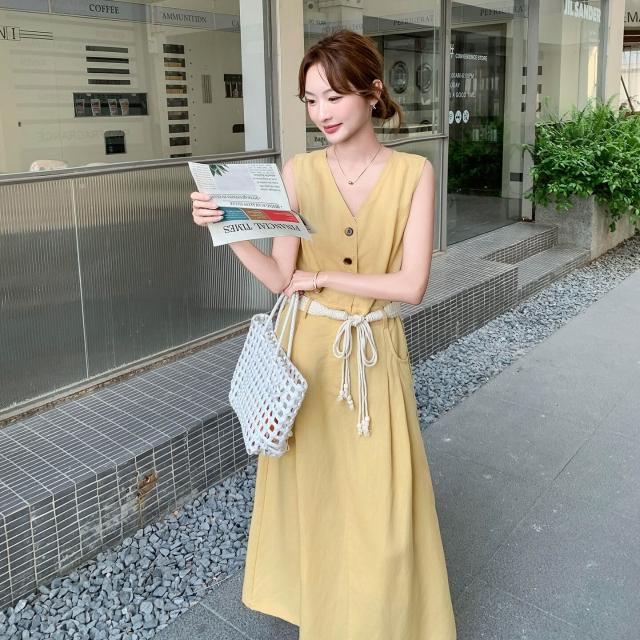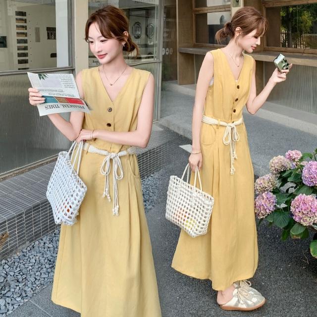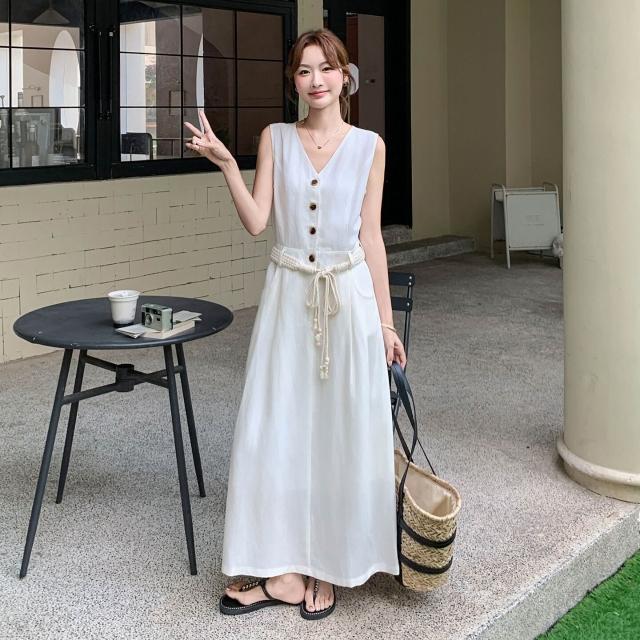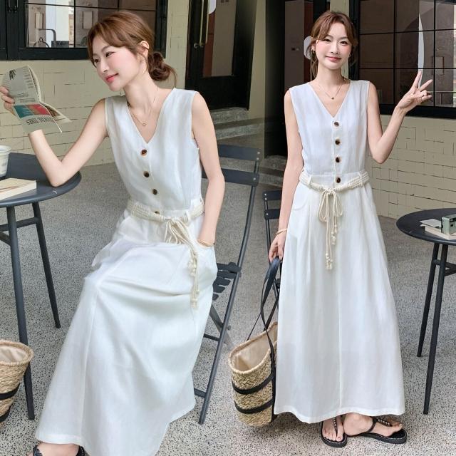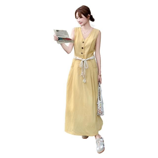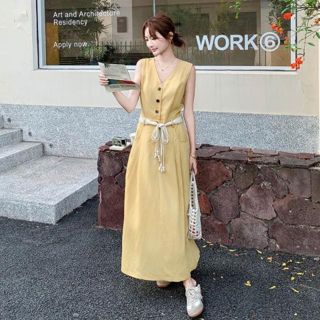 溫柔風無袖V領連衣裙女2025夏季新款設計感收腰顯瘦A字長裙SX3150