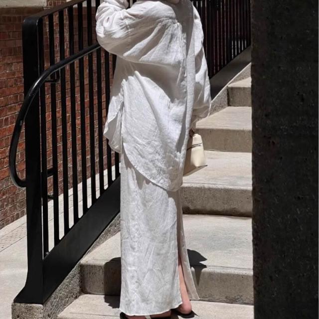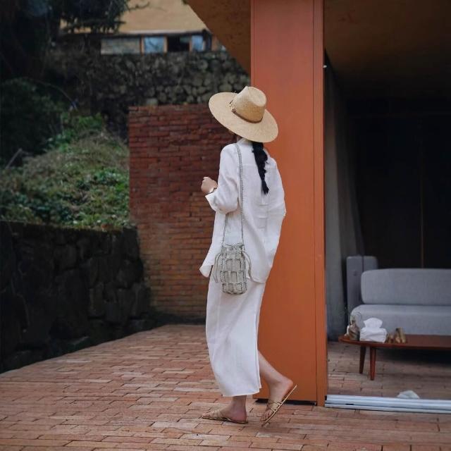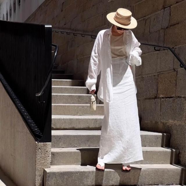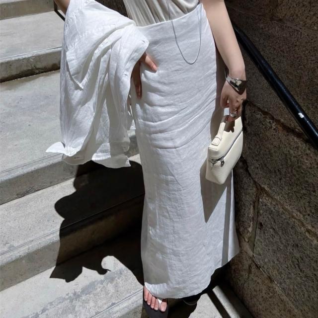 新款法式度假慵懶高級感老錢風100%純亞麻後開衩半身裙女長裙5201