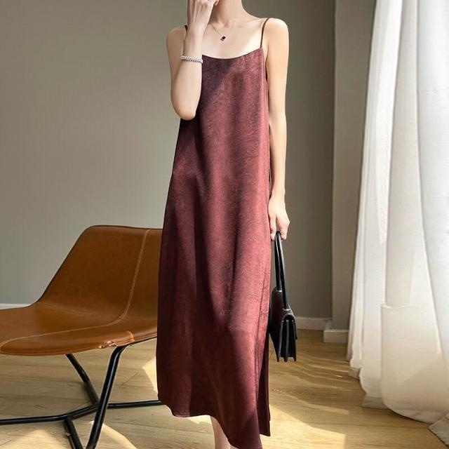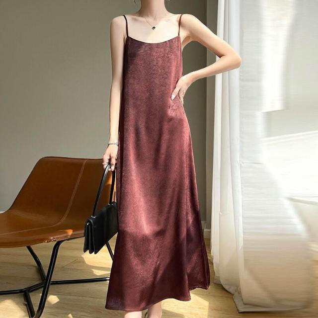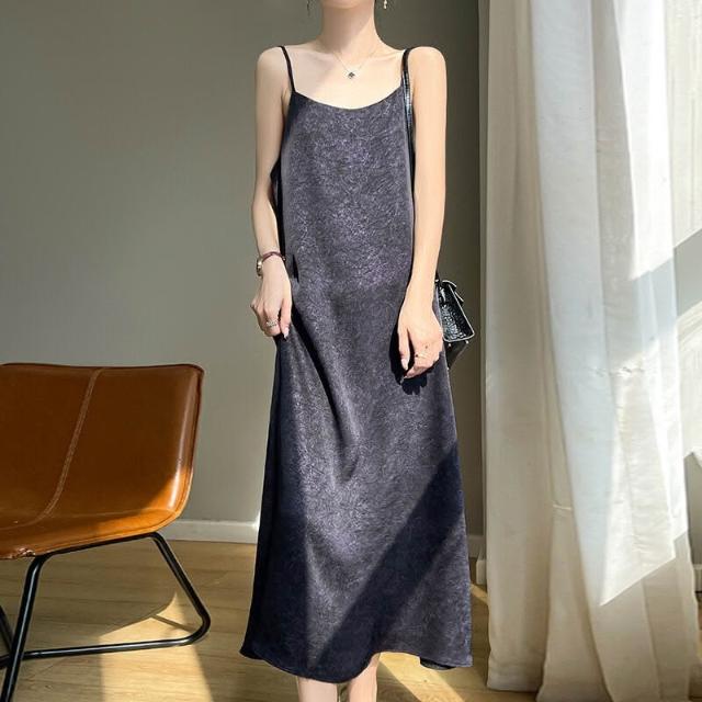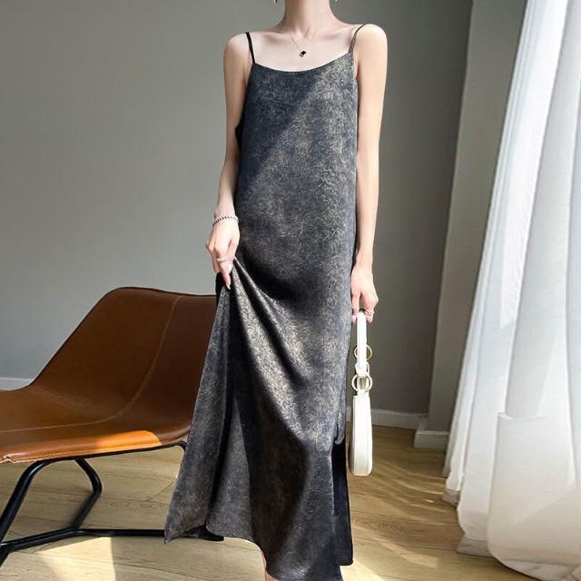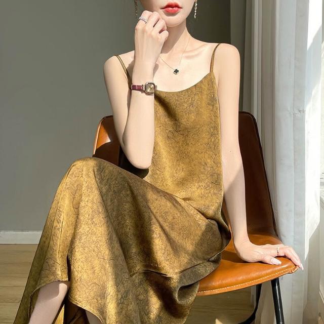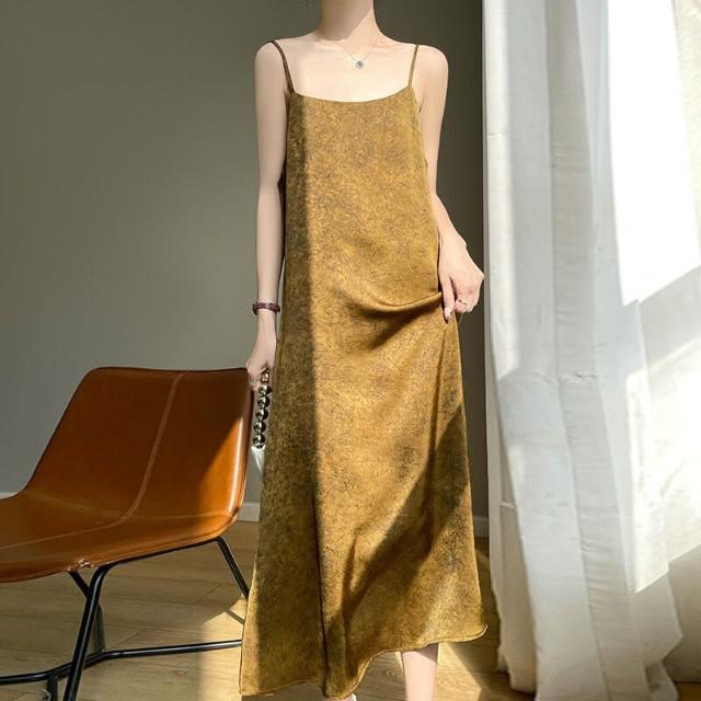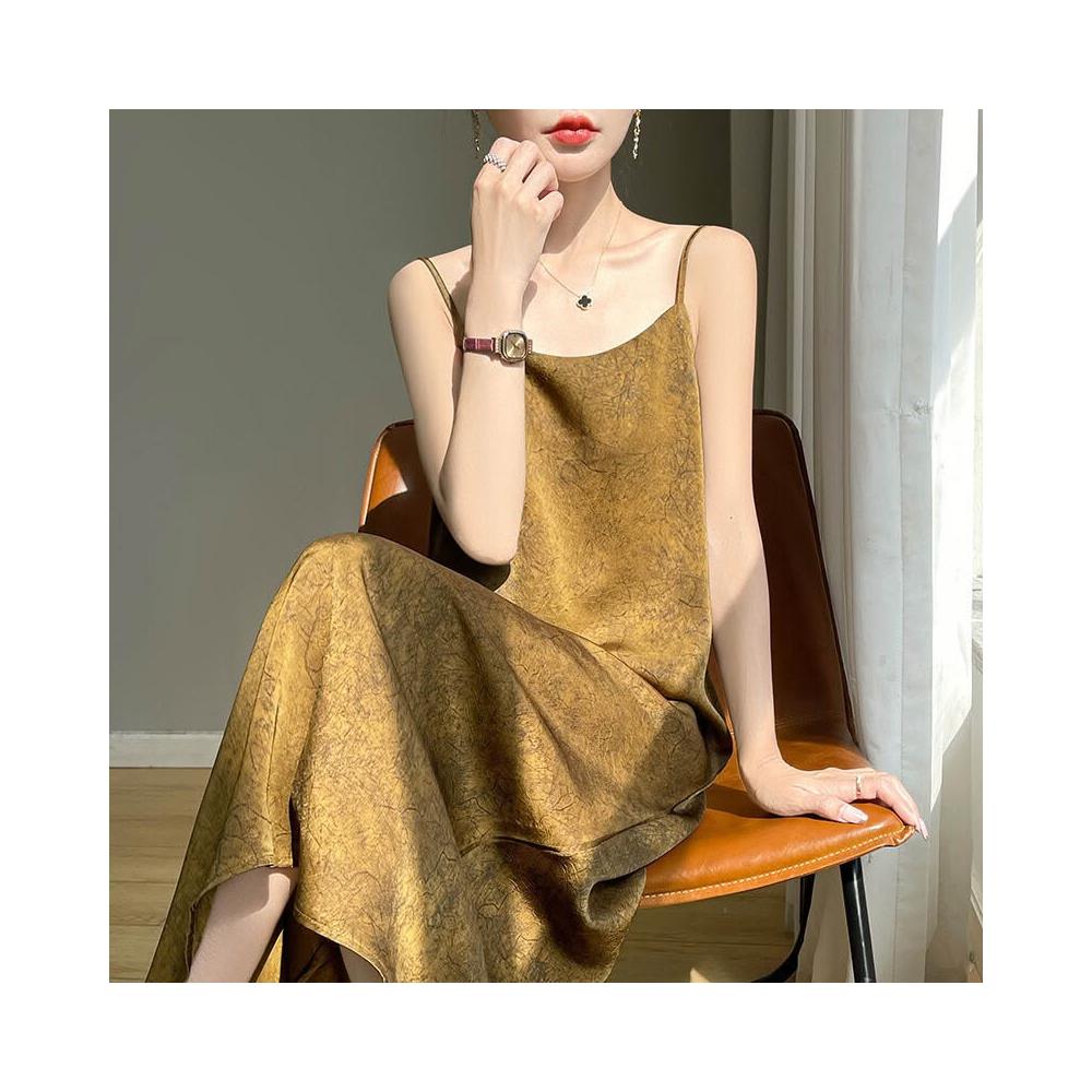 真絲高端鎏金醋酸緞面吊帶裙女可調龜裂紋香雲紗新中式長款連衣裙