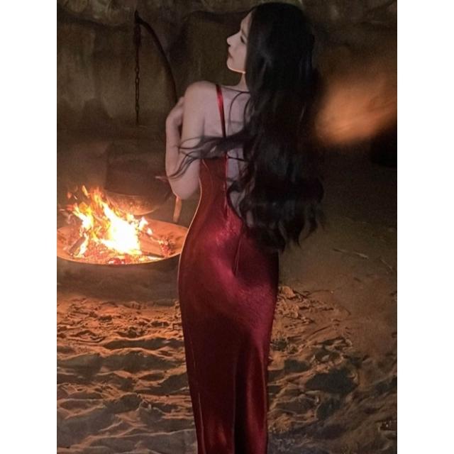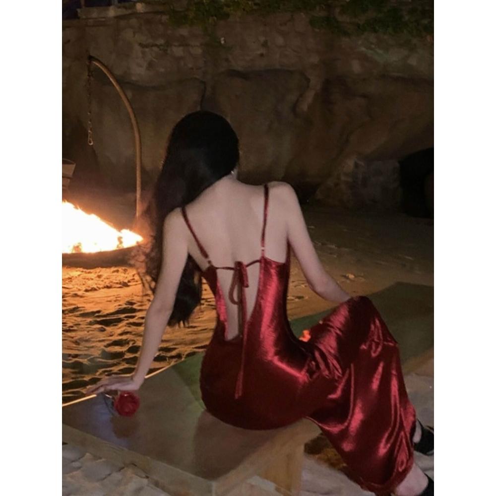 吊帶紅色醋酸性感蕩領包臀露背修身海邊度假聖誕年會內搭裙子