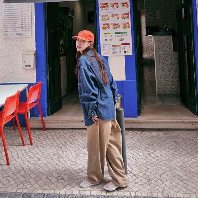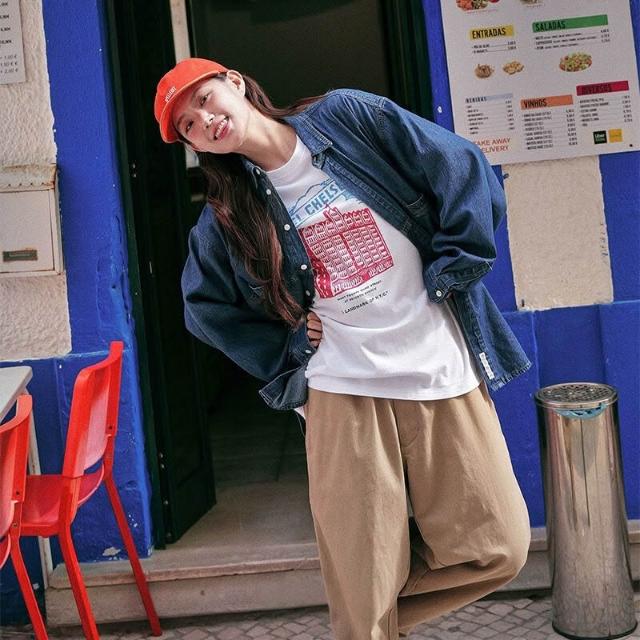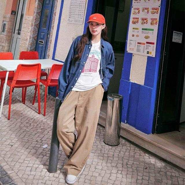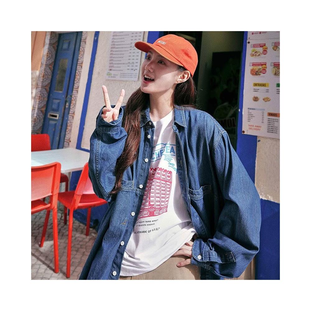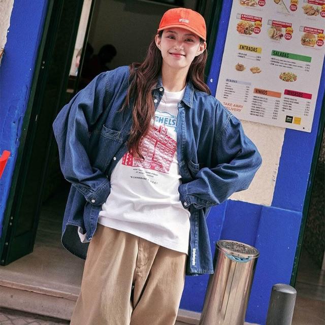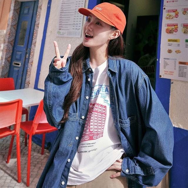 2025年秋季新品隱扣設計牛仔襯衫深藍色上衣外套寬松女