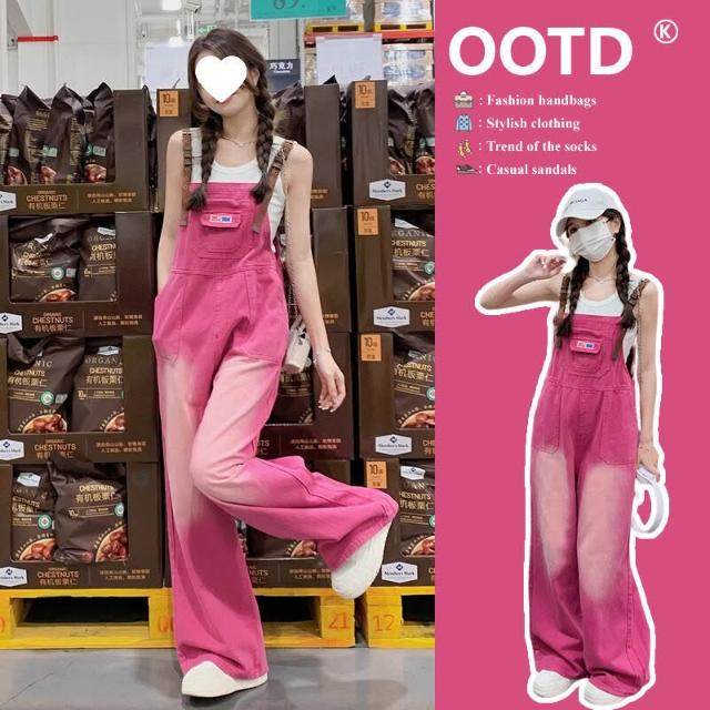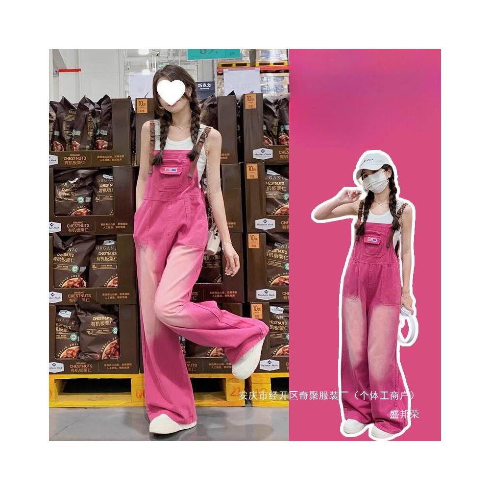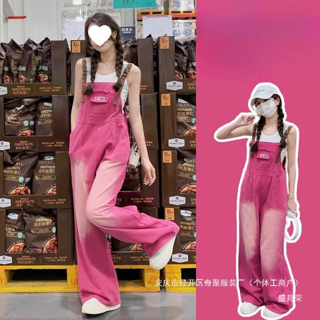 甜辣背帶褲女夏小個子減齡可愛寬松休閑設計感樹莓粉色工裝牛仔褲