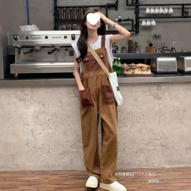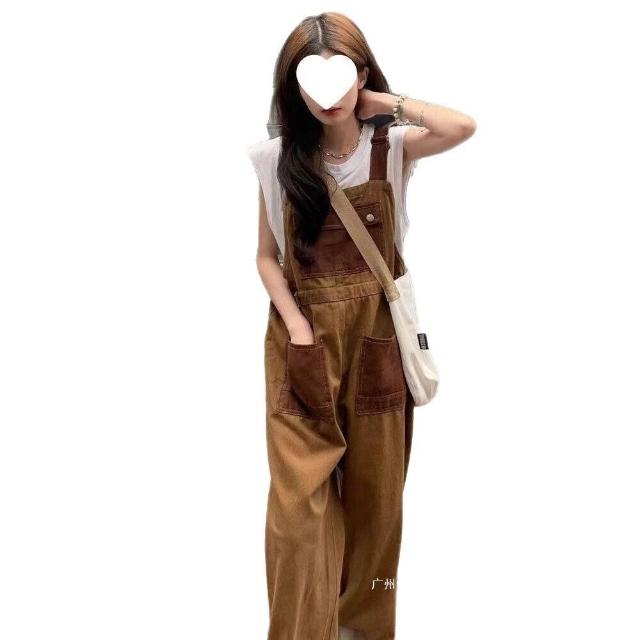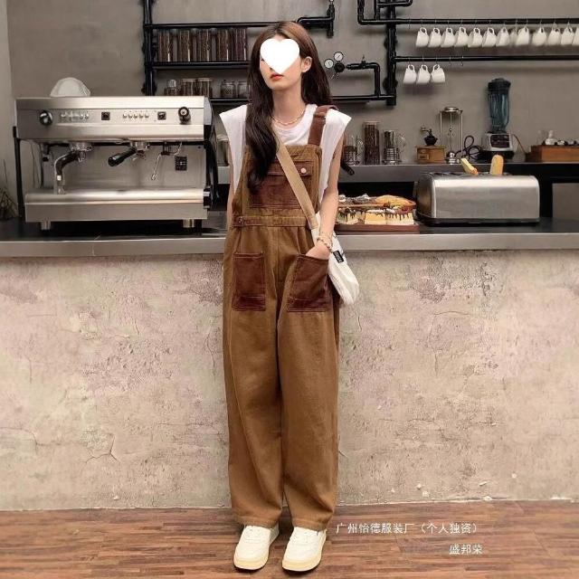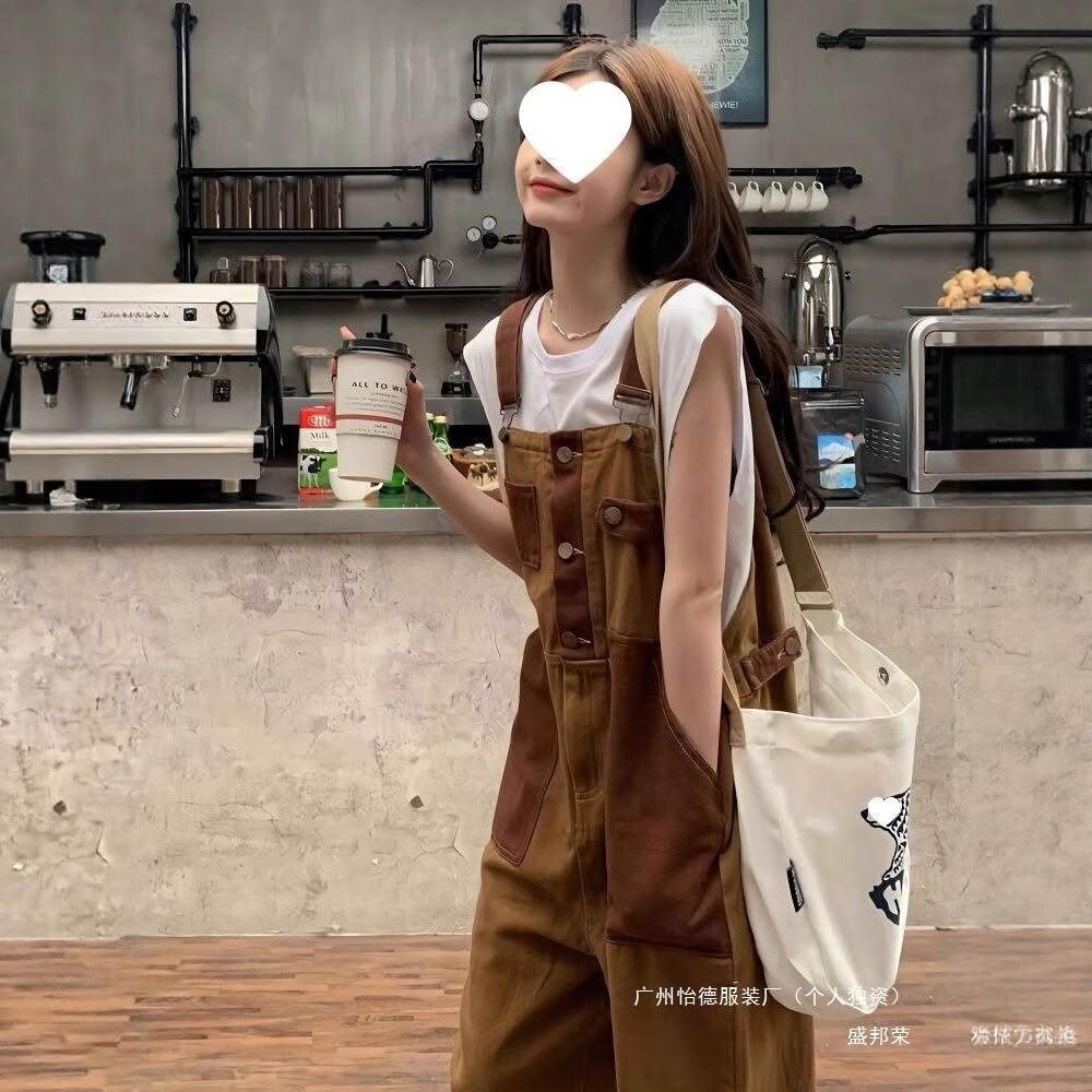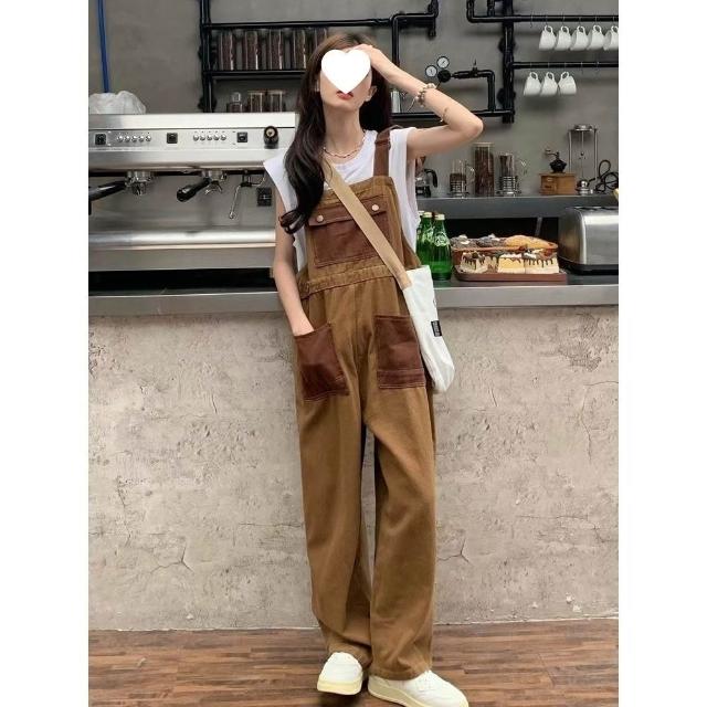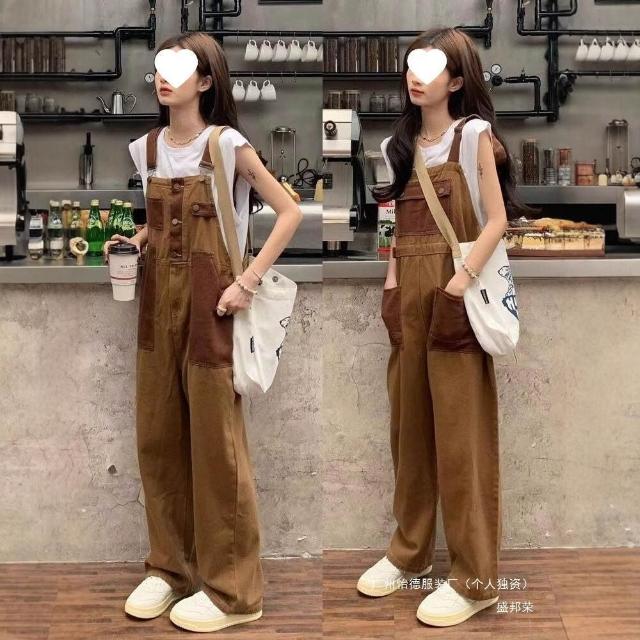 夏新款連體寬松美式棉牛仔背帶褲女拖地直筒牛仔背帶褲