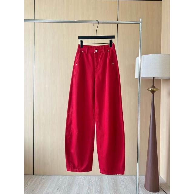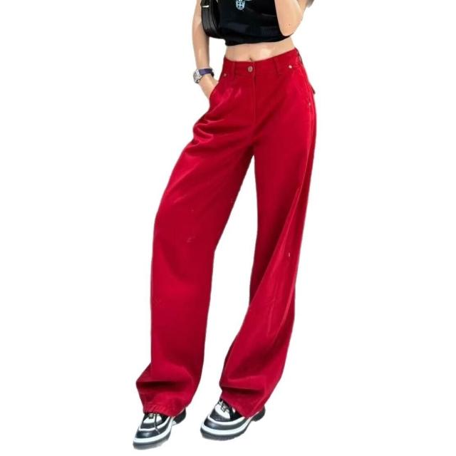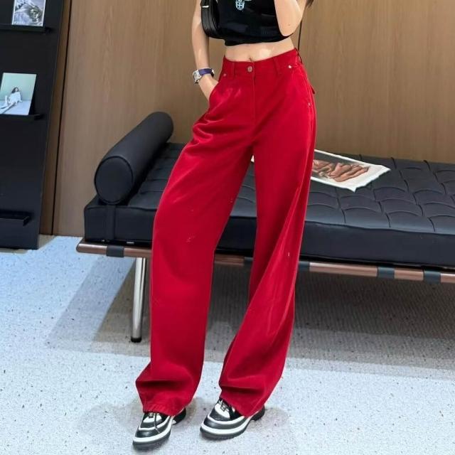 顯瘦小彎刀闊腿褲 紅色牛仔褲 刺繡高定長褲 南油女褲 秋款牛仔長褲