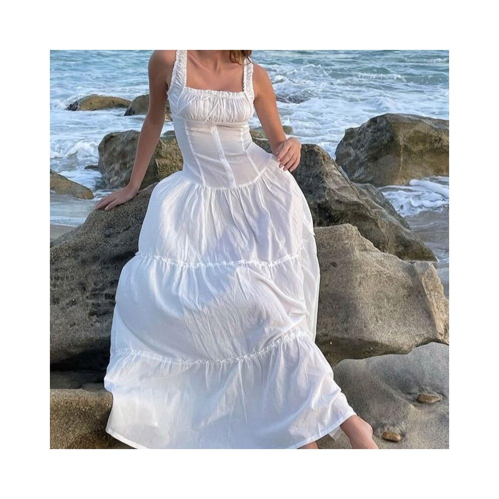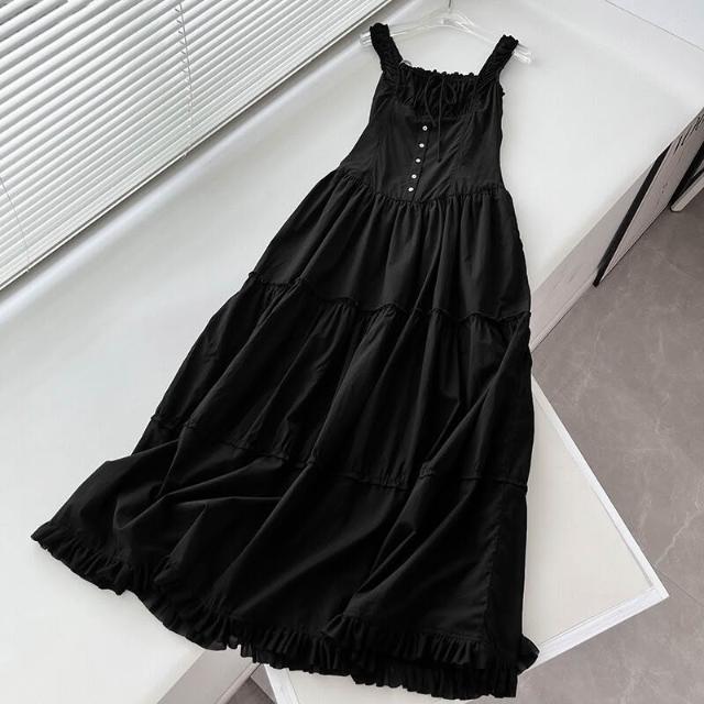 夏季新款慵懶度假風褶皺邊前開扣設計超長連衣裙高級女神裙大擺裙