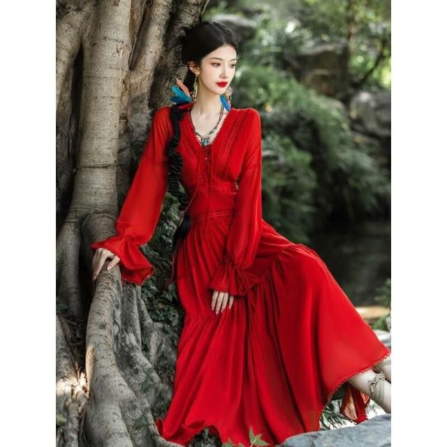 紅色民族風連衣裙新疆沙漠裙子異域風情草原西北雲南旅遊穿搭女裝
