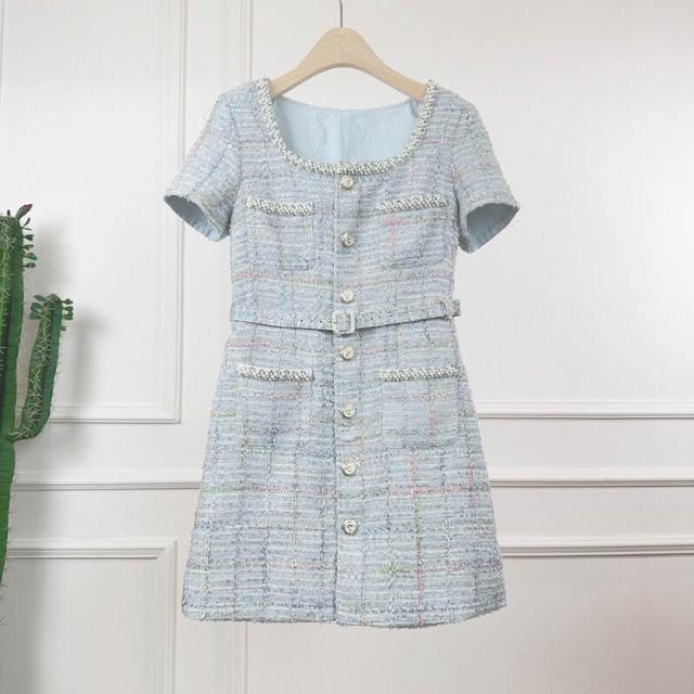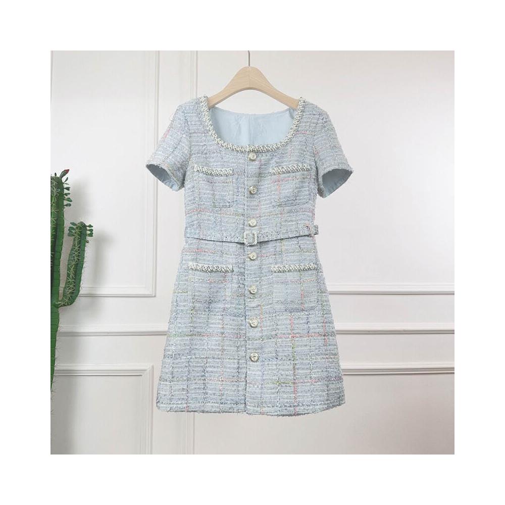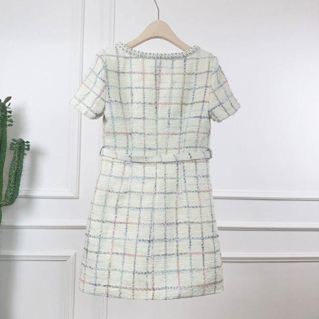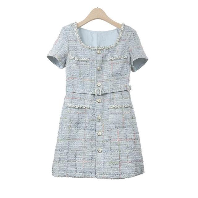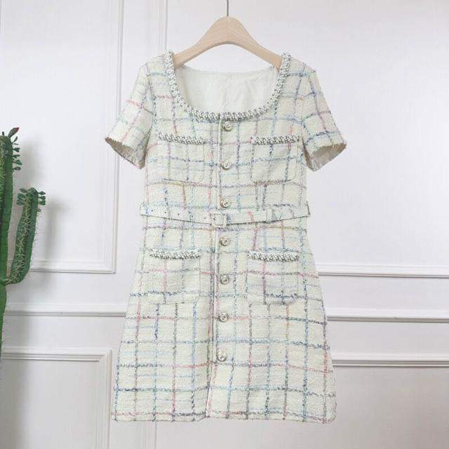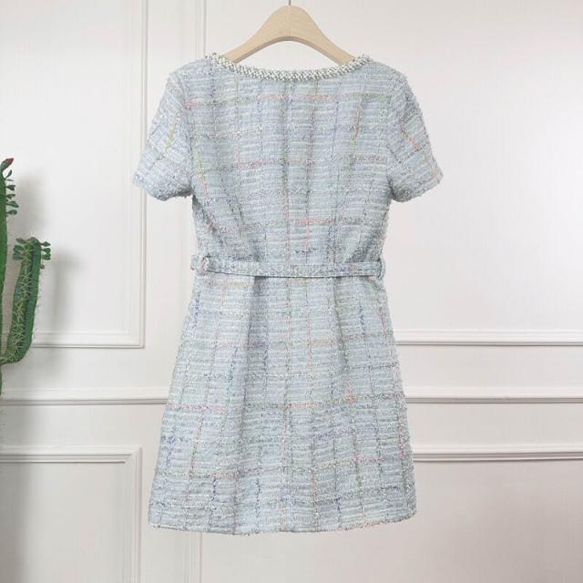 25夏春秋裝新款小香風氣質格紋珍珠圓領修身顯瘦短袖連衣裙短裙