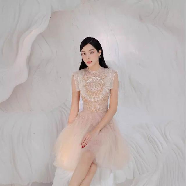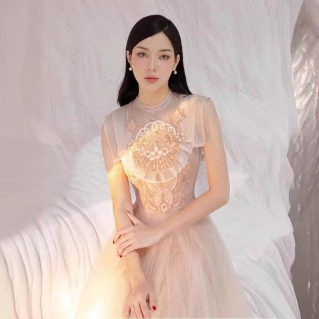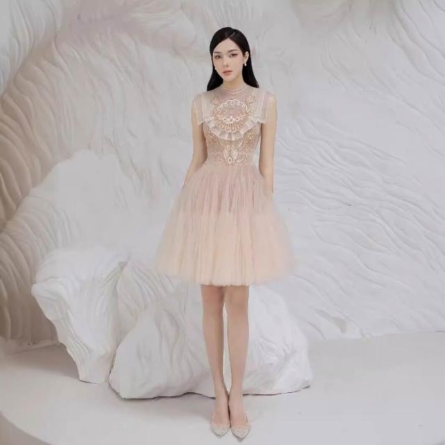 2025年夏季香槟色連衣裙蝴蝶刺繡網紗蓬蓬短裙公主裙