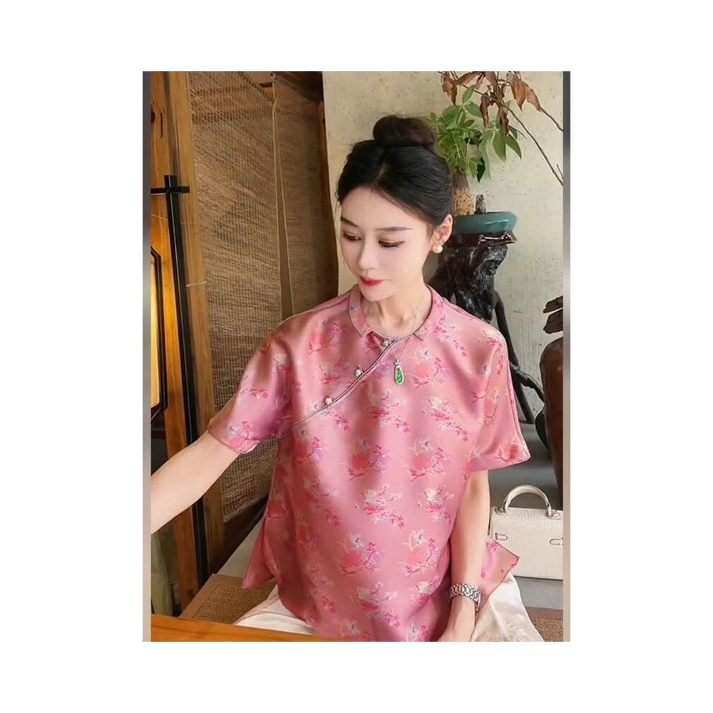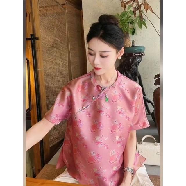 新中式女裝2025夏裝獨特別致唐裝中國風粉色短袖襯衫高端宋錦上衣