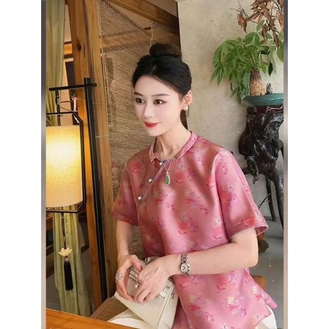 新中式女裝2025夏裝獨特別致唐裝中國風粉色短袖襯衫高端宋錦上衣