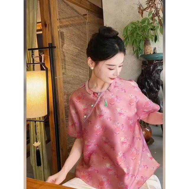 新中式女裝2025夏裝獨特別致唐裝中國風粉色短袖襯衫高端宋錦上衣