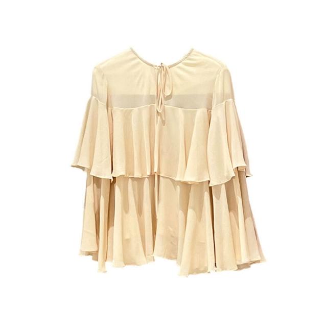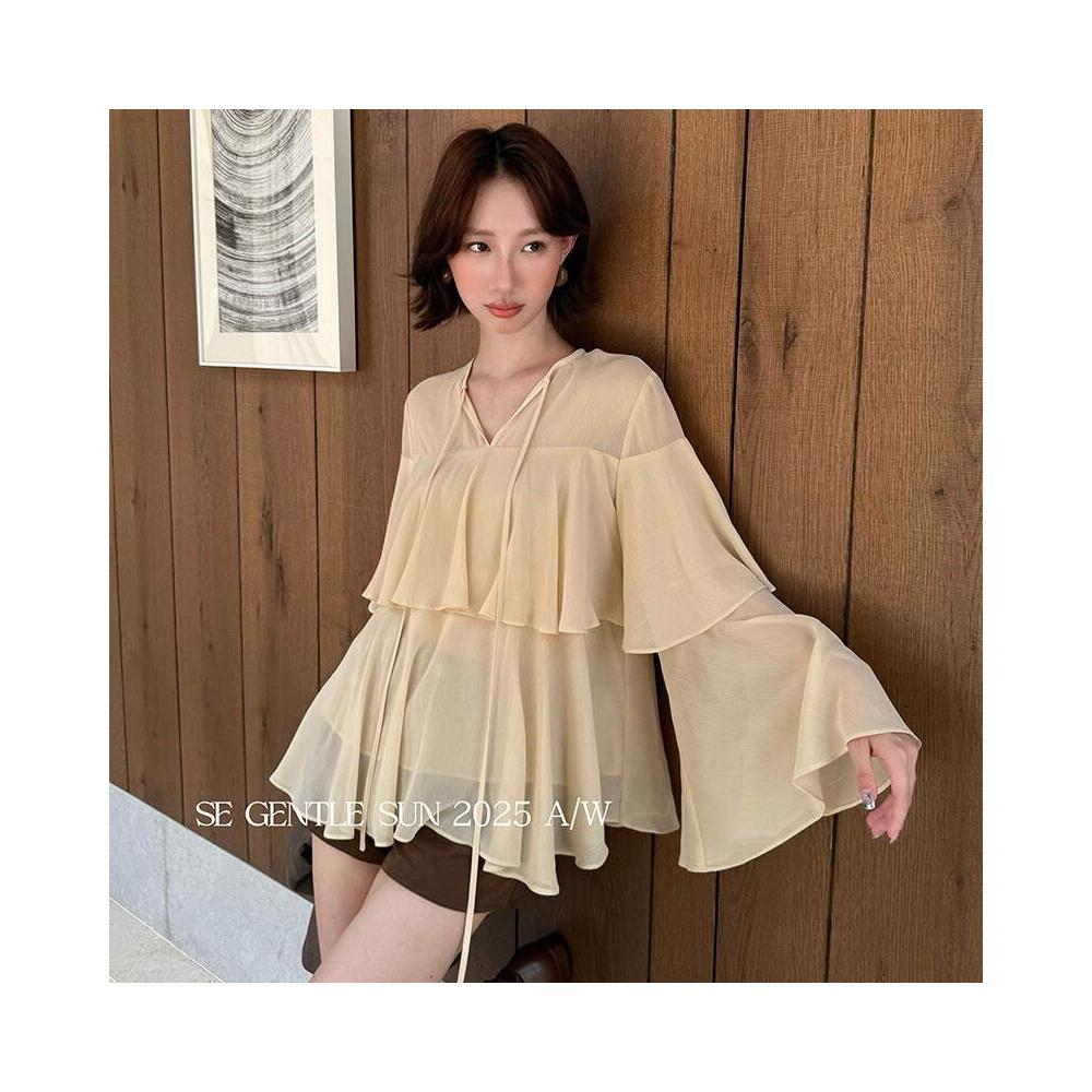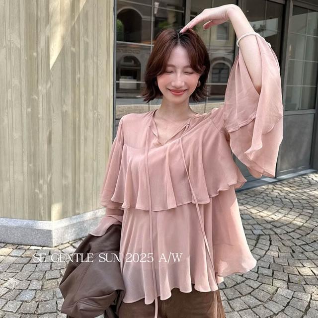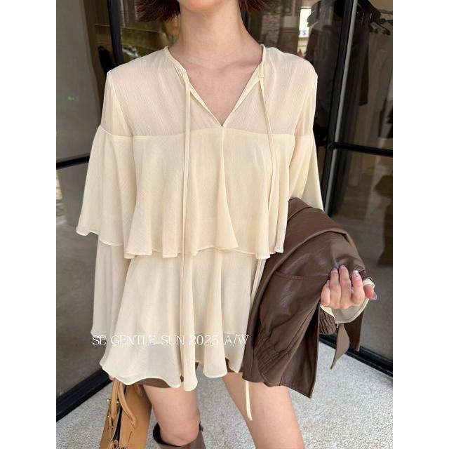 秀熙熙2025秋季白標顯瘦氣質百搭荷葉V領雪紡上衣長袖小衫女89559