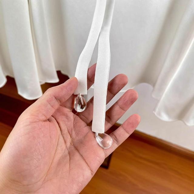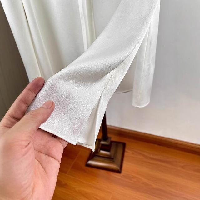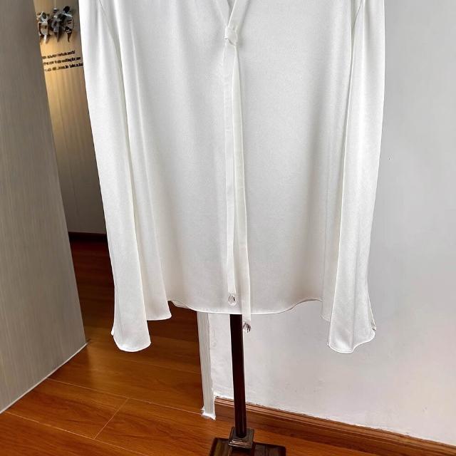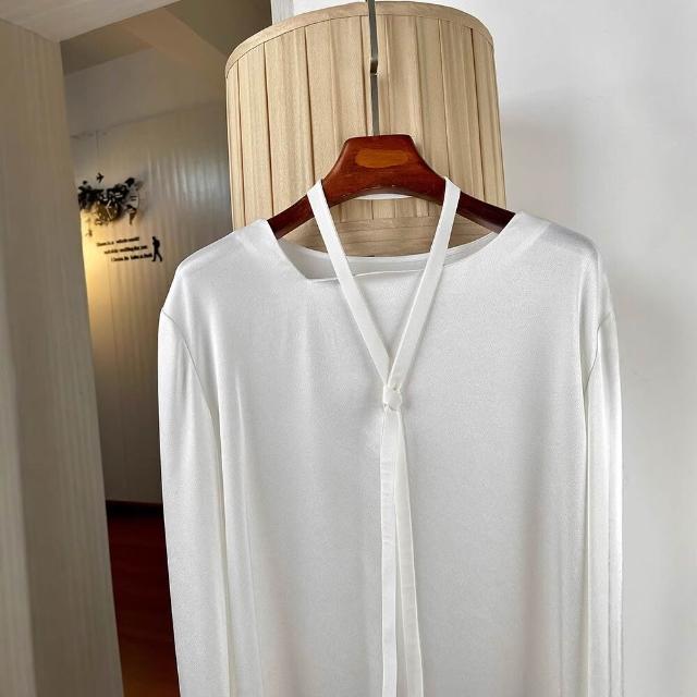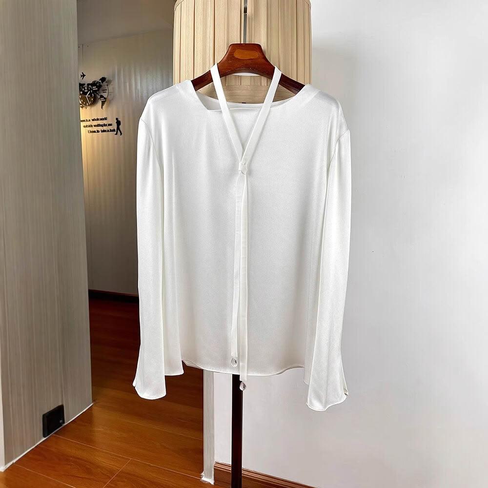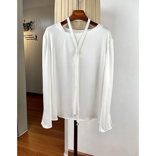 歐貨斜領掛脖系帶醋酸緞面薄款長袖襯衫女春夏新款寬松落肩袖上衣