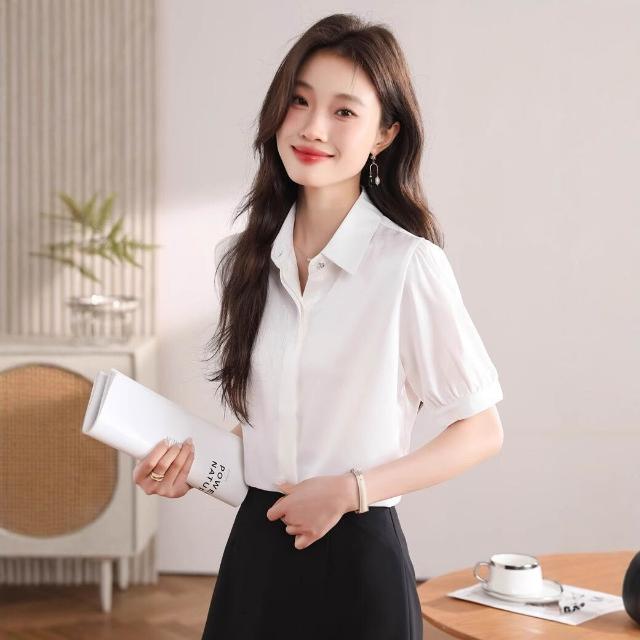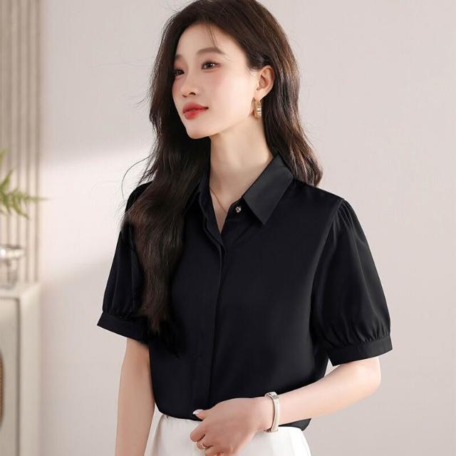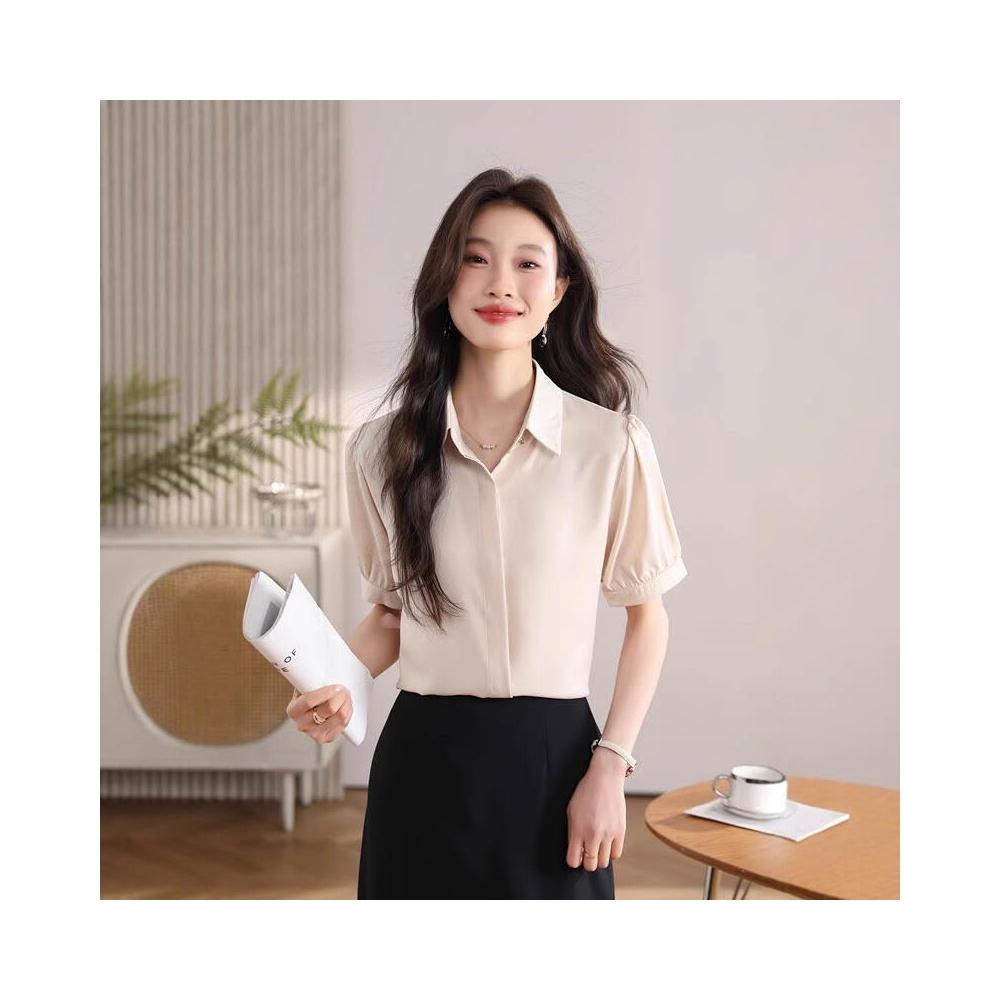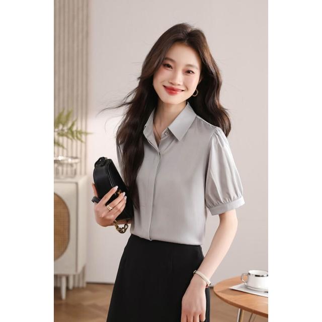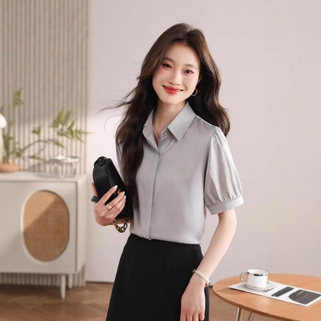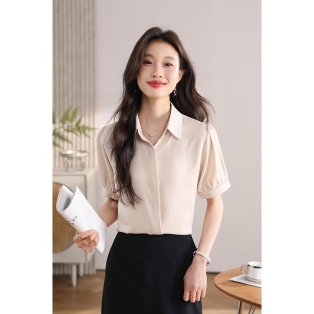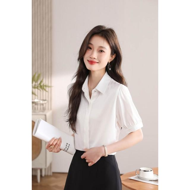 白色緞面短袖襯衫女夏季OL職業正裝通勤垂感不易皺工作面試襯衣