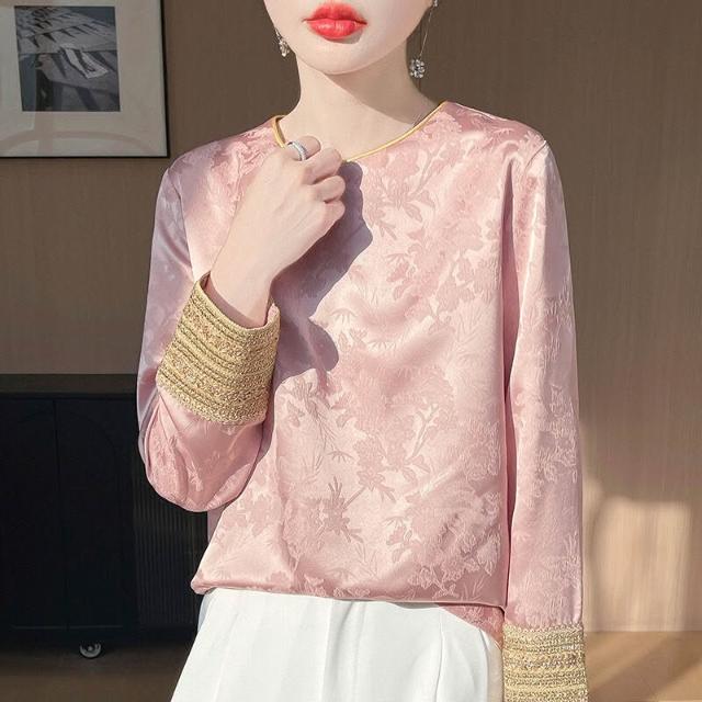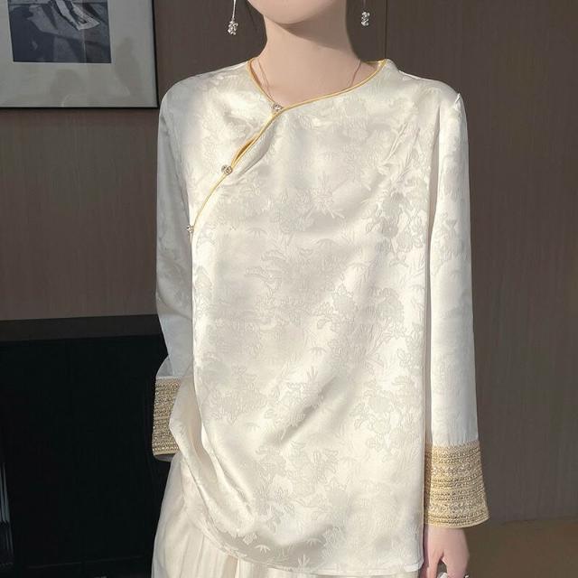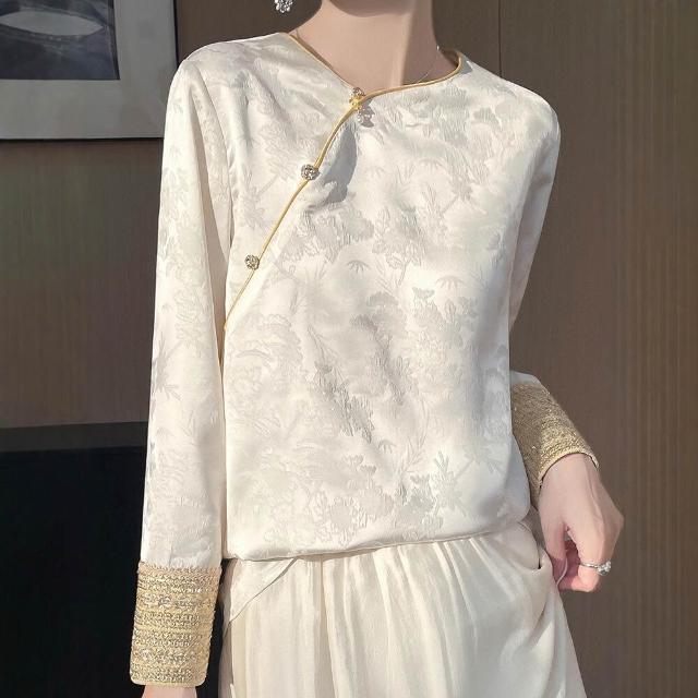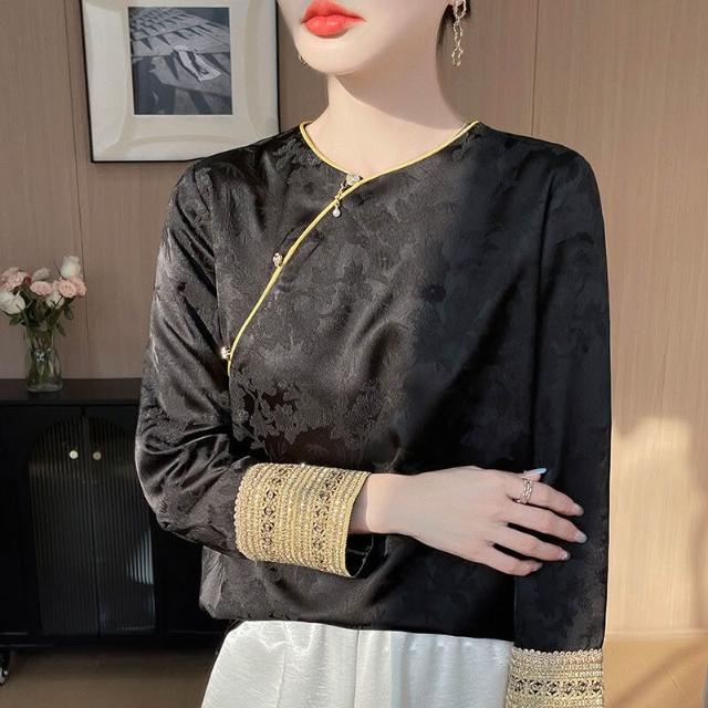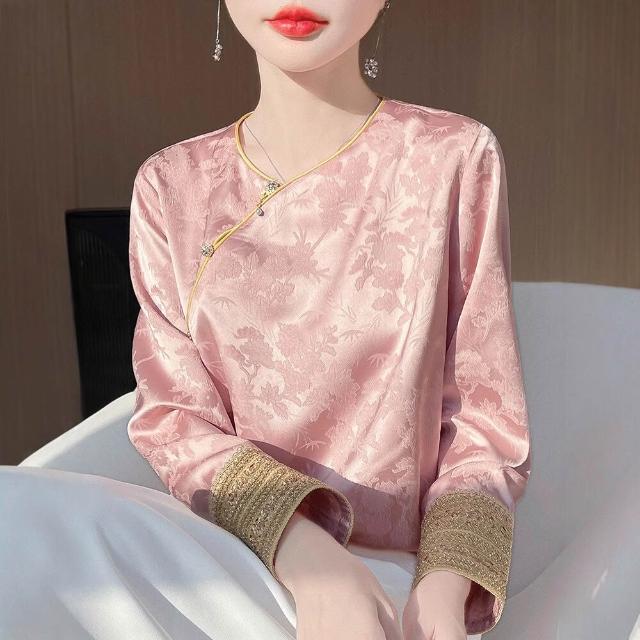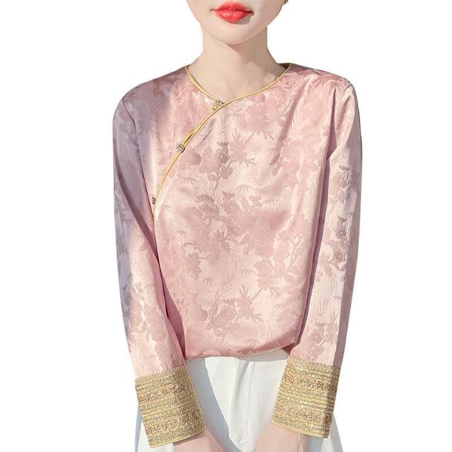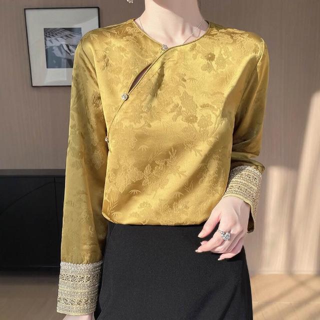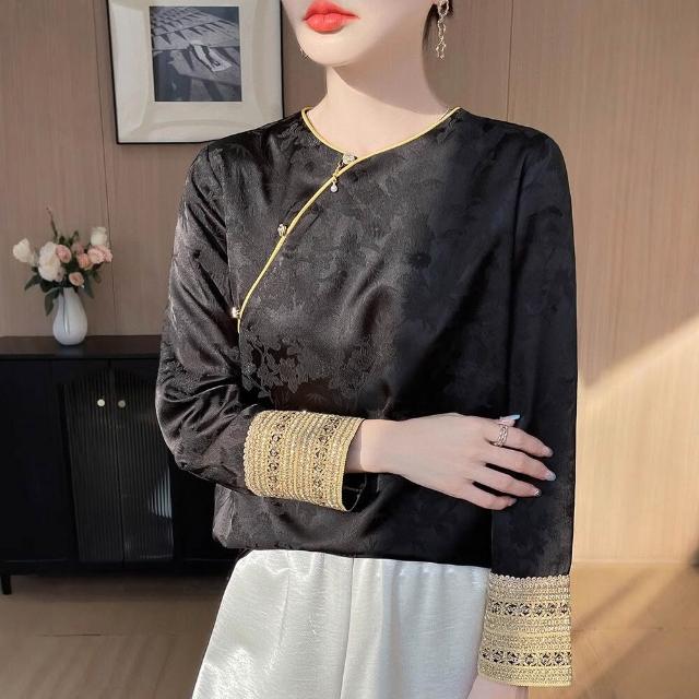 新中式國風女裝刺繡襯衫女裝25春季新醋酸緞面高級感拼接長袖上衣
