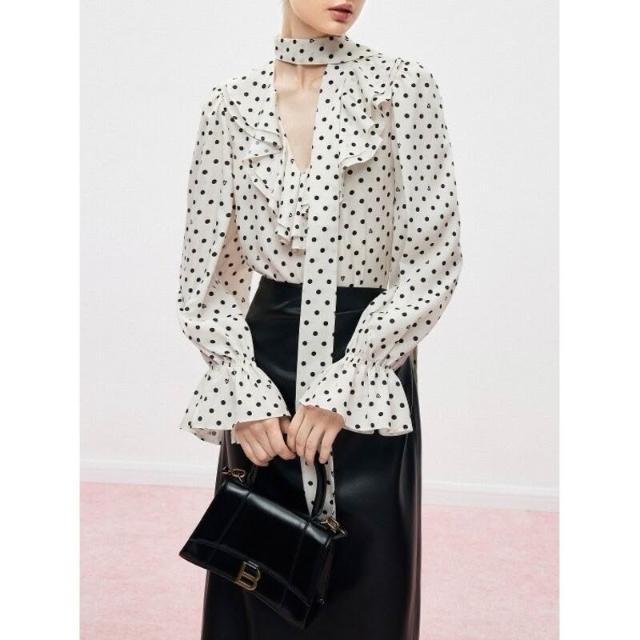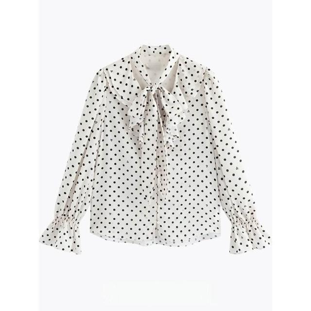 2025新款法式蝴蝶結飄帶波點卡圓點襯衫女秋季長袖氣質緞面上衣